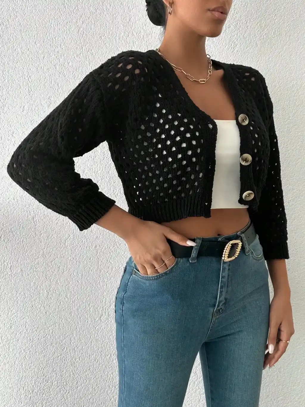 Şık ve şık bir görünüm elde etmek için ideal olan Büyük Düğmeli Delikli Hırka siyah rengiyle dikkat çekiyor.