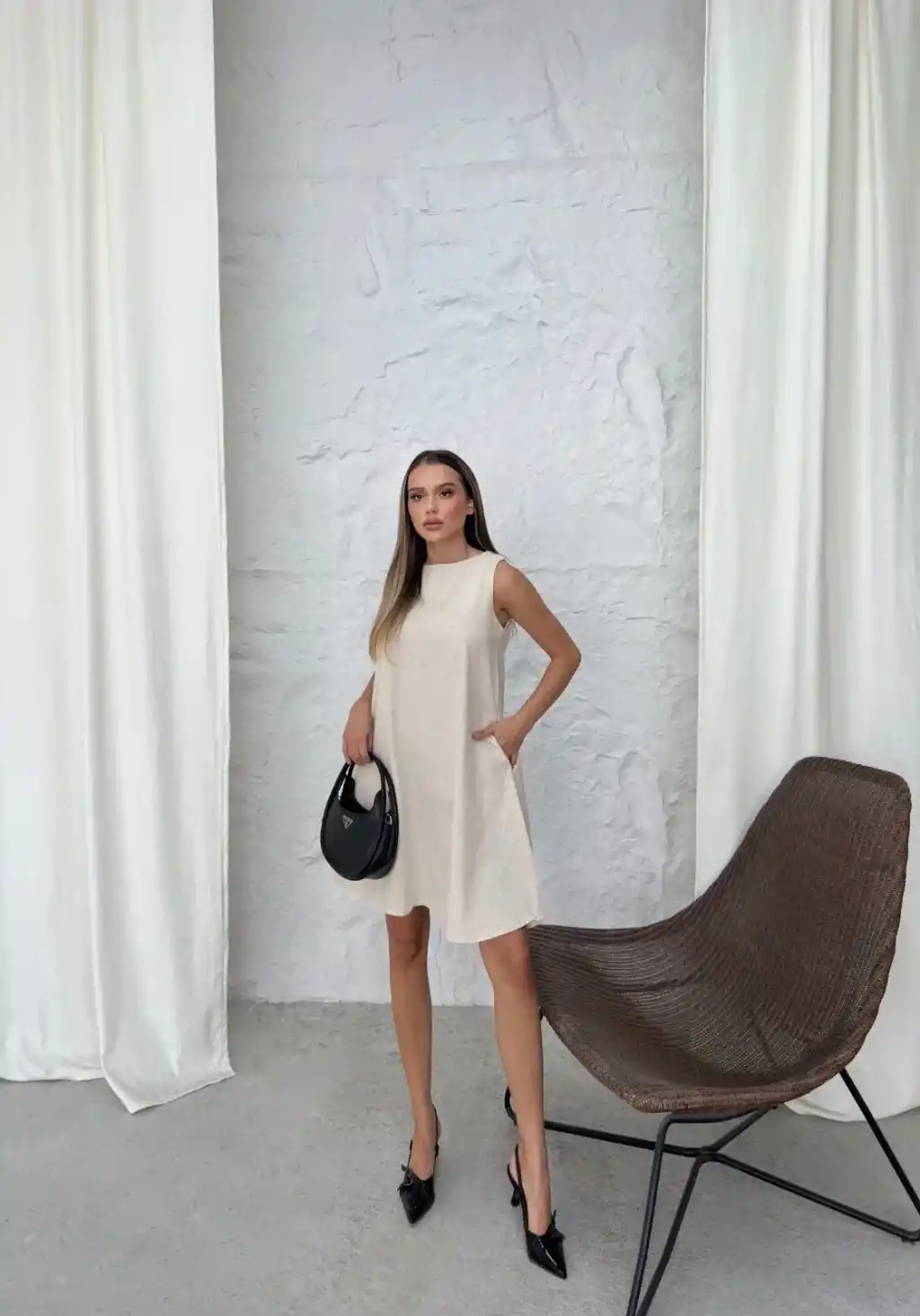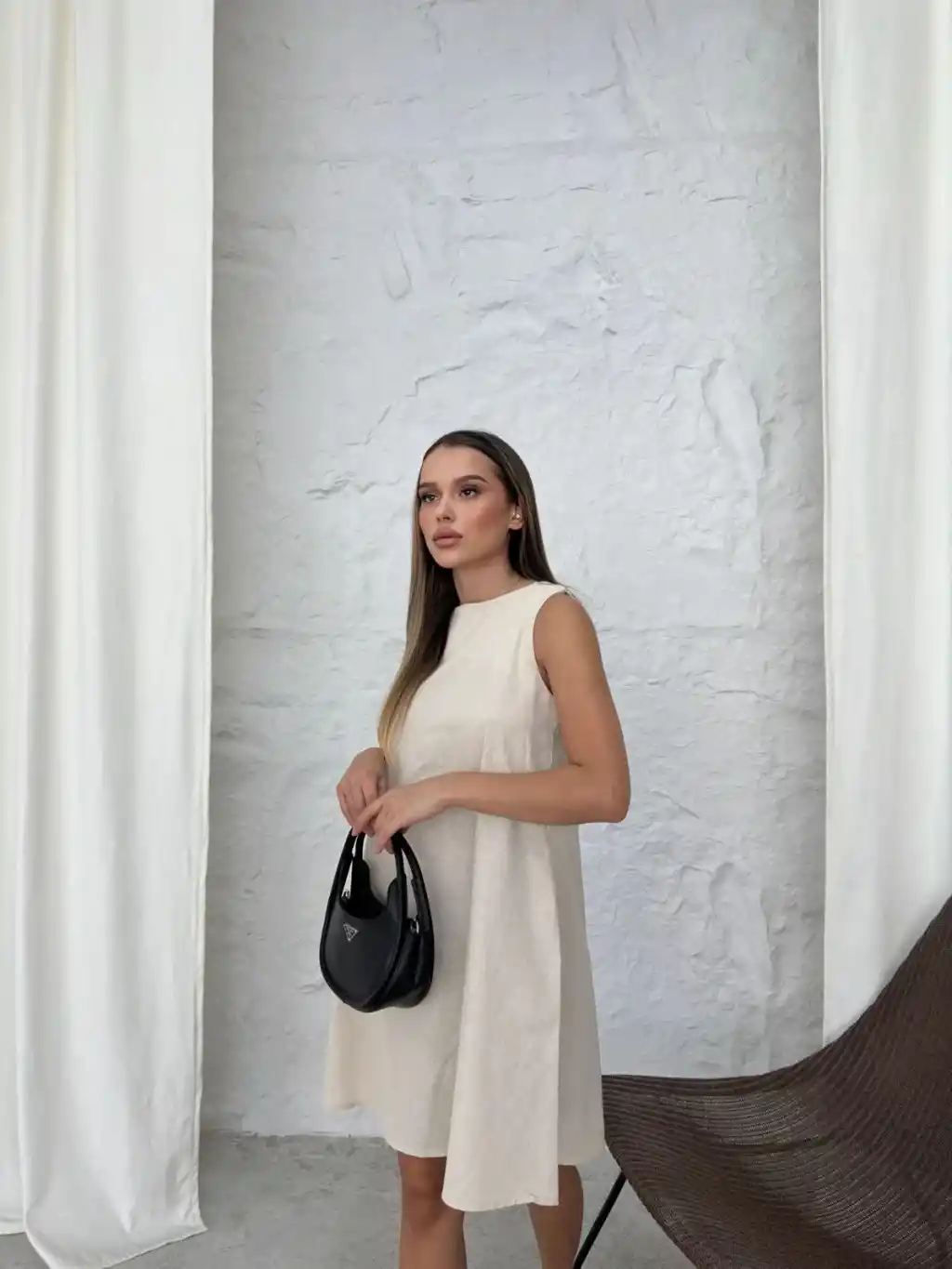 Askılı ch kumaş düğmeli elbise pudrabeyaz h265007