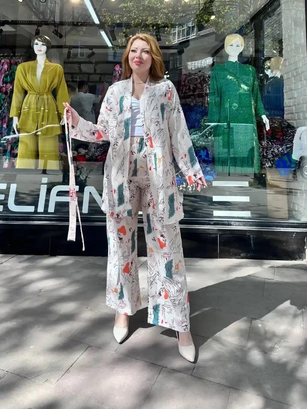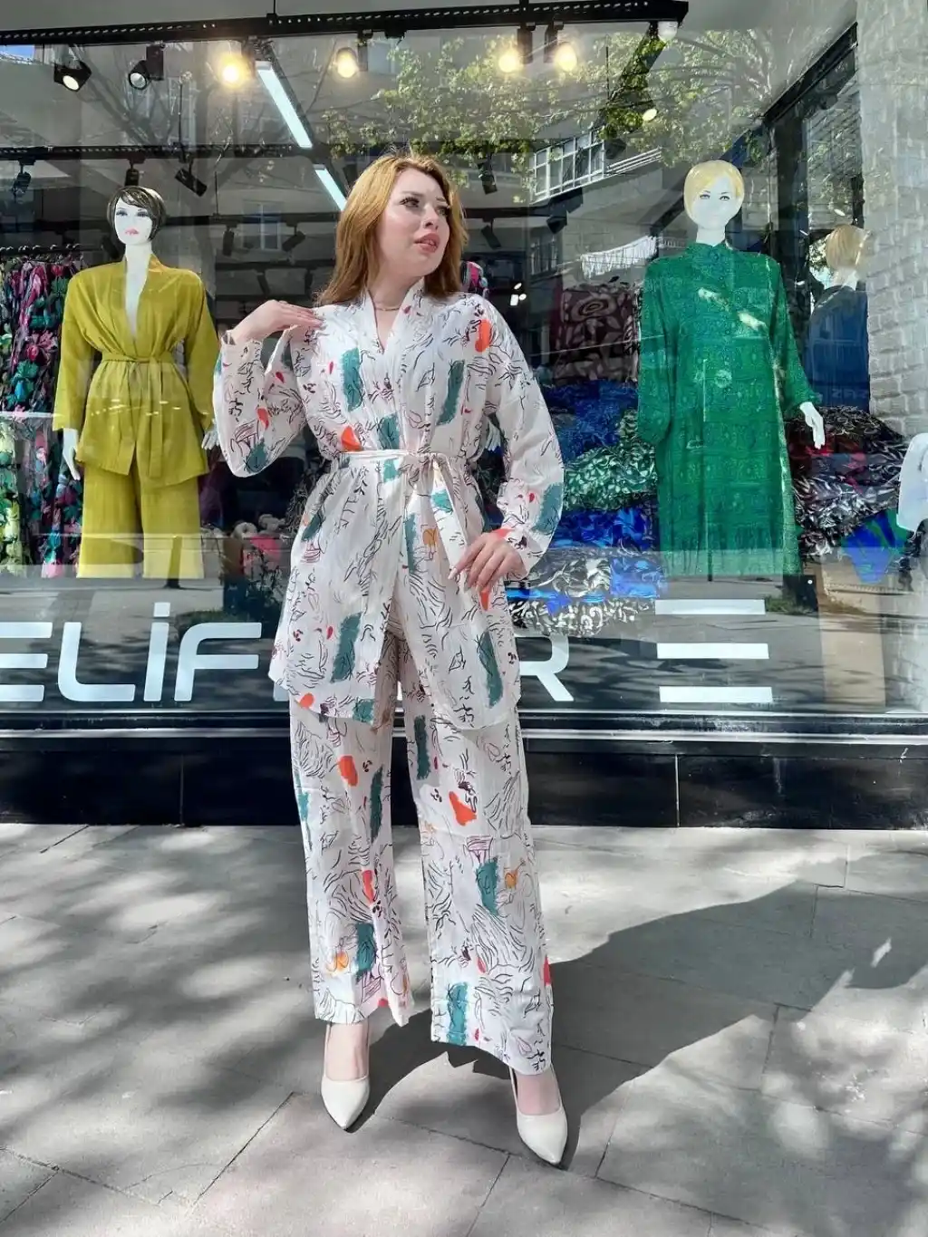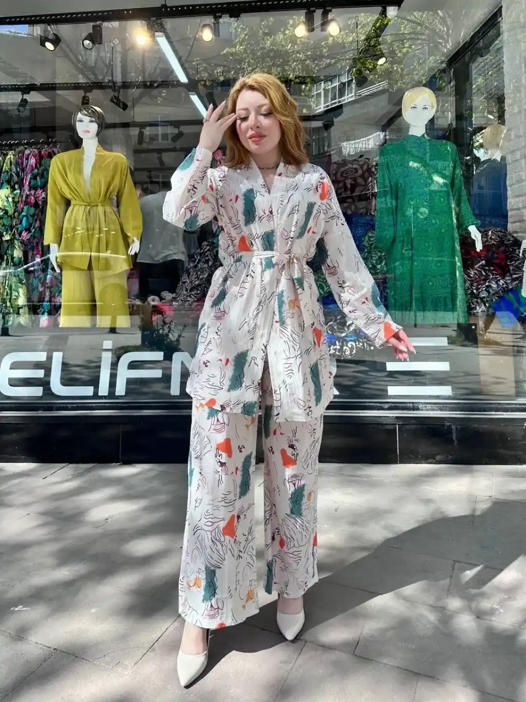 Pantolon yırtmaçlı elbise ikili triko takım vizon elf