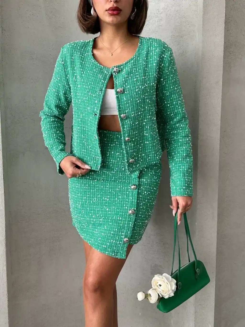 Modaya uygun ve tarz sahibi bir görünüm elde etmek isteyen kadınların tercihi olan Ceketli Etek Takım CHL Kumaş Yeşil H24443, gardırobunuzun vazgeçilmez parçalarından biri olmaya aday!