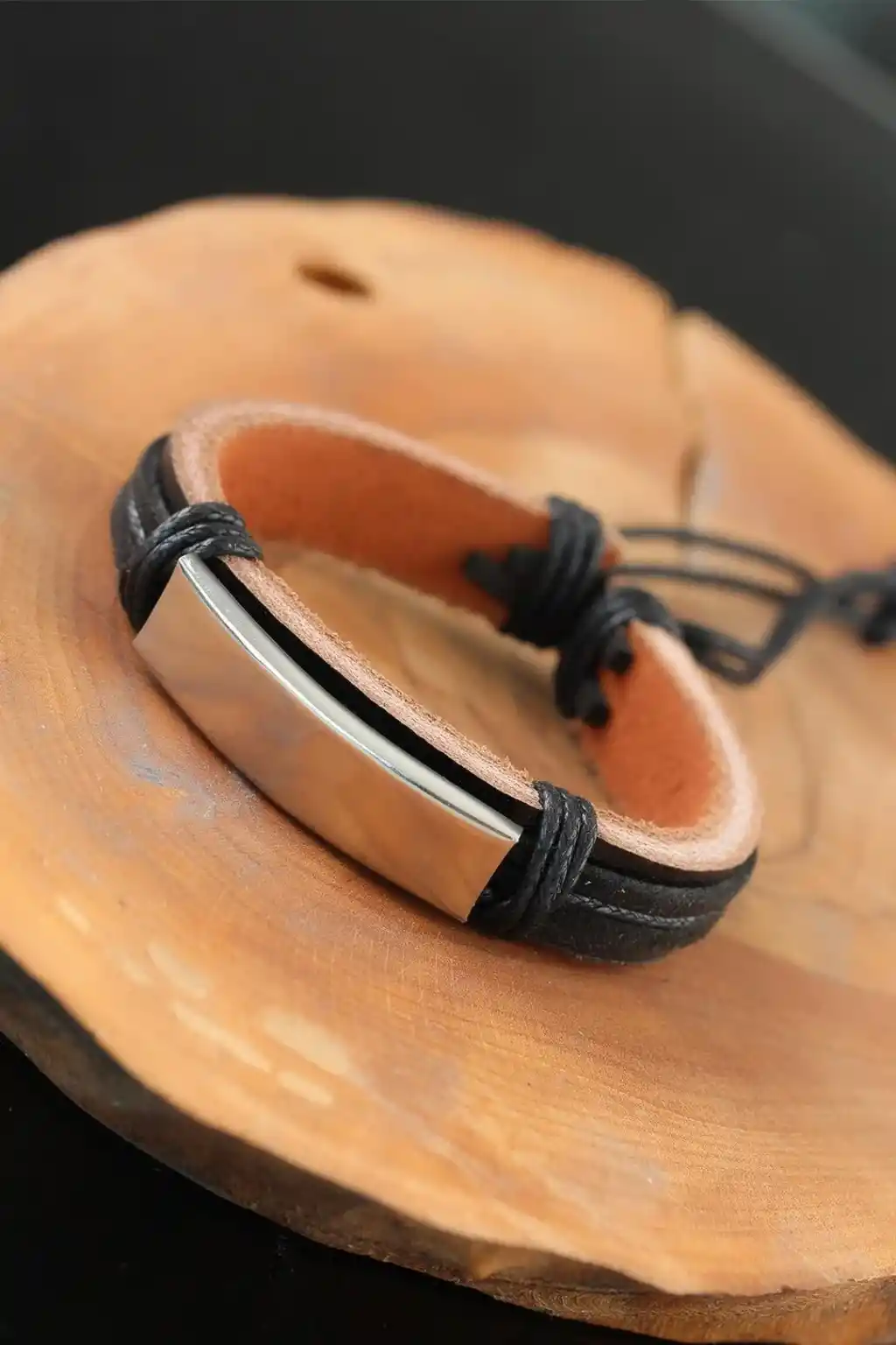 Çelik Aksesuarlı Siyah Renk Deri Erkek Bileklik