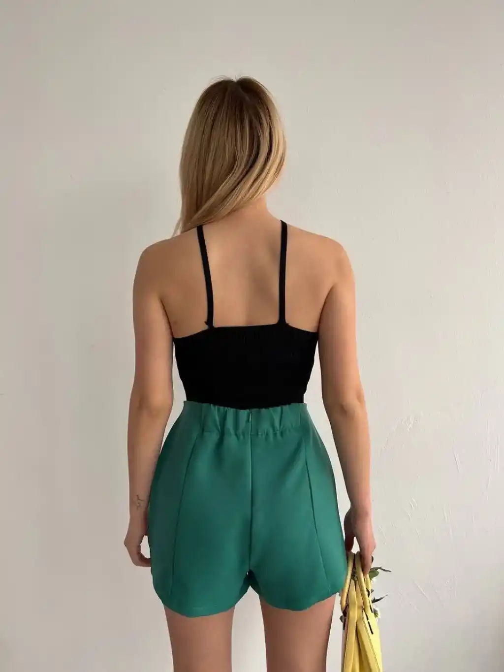 Çift yırtmaç detayıyla öne çıkan yeşil atlas şort etek, gardırobunuzun favori parçalarından biri olmaya aday.