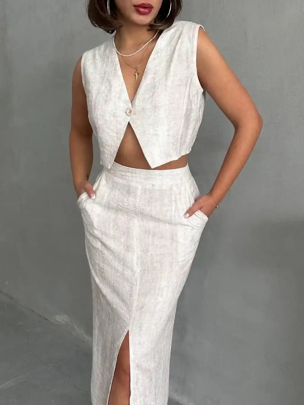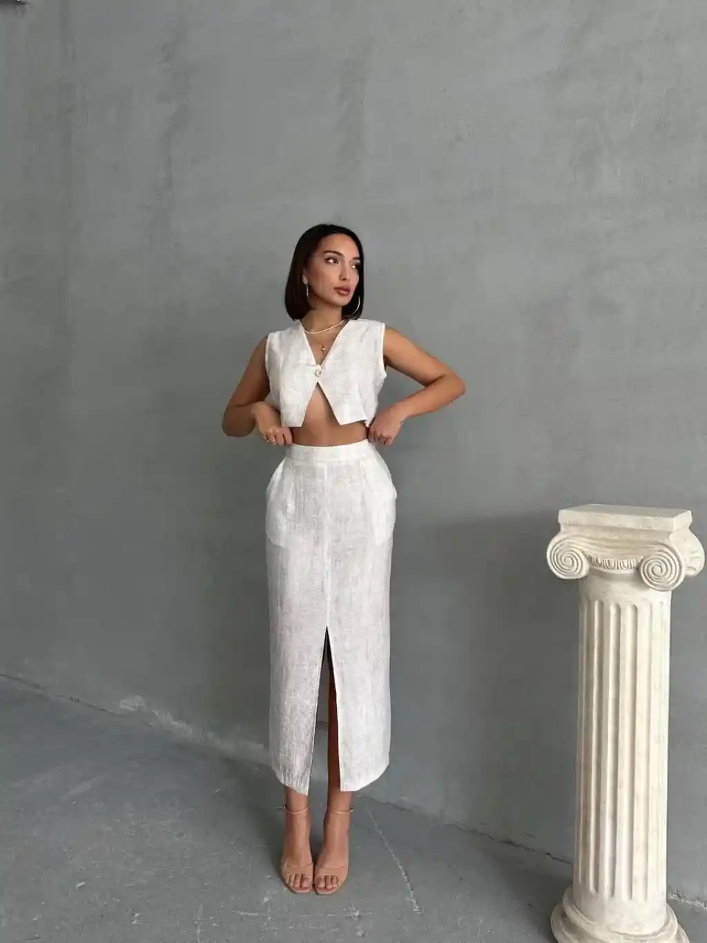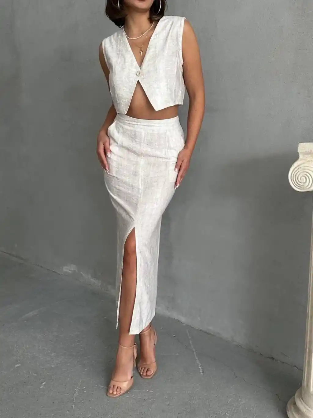 Pantolon yırtmaçlı elbise ikili triko takım vizon elf