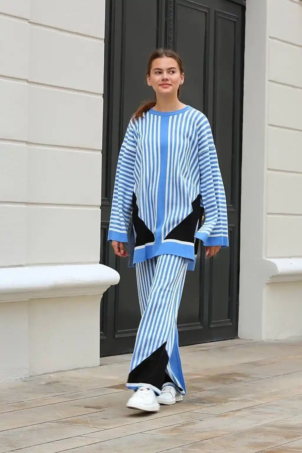 Çizgili bisiklet yaka triko takım Mavi, şıklığı ve konforu bir araya getiren kadınlar için ideal bir seçimdir.