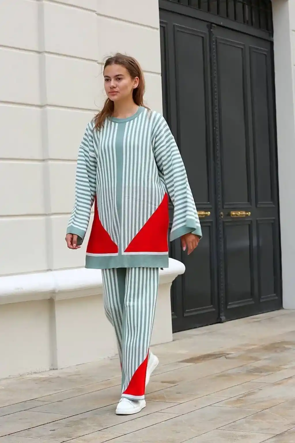 Kadınların şıklığına şıklık katacak Çizgili Bisiklet Yaka Triko Takım Mint, hem rahatlığı hem de şıklığı bir arada sunuyor.