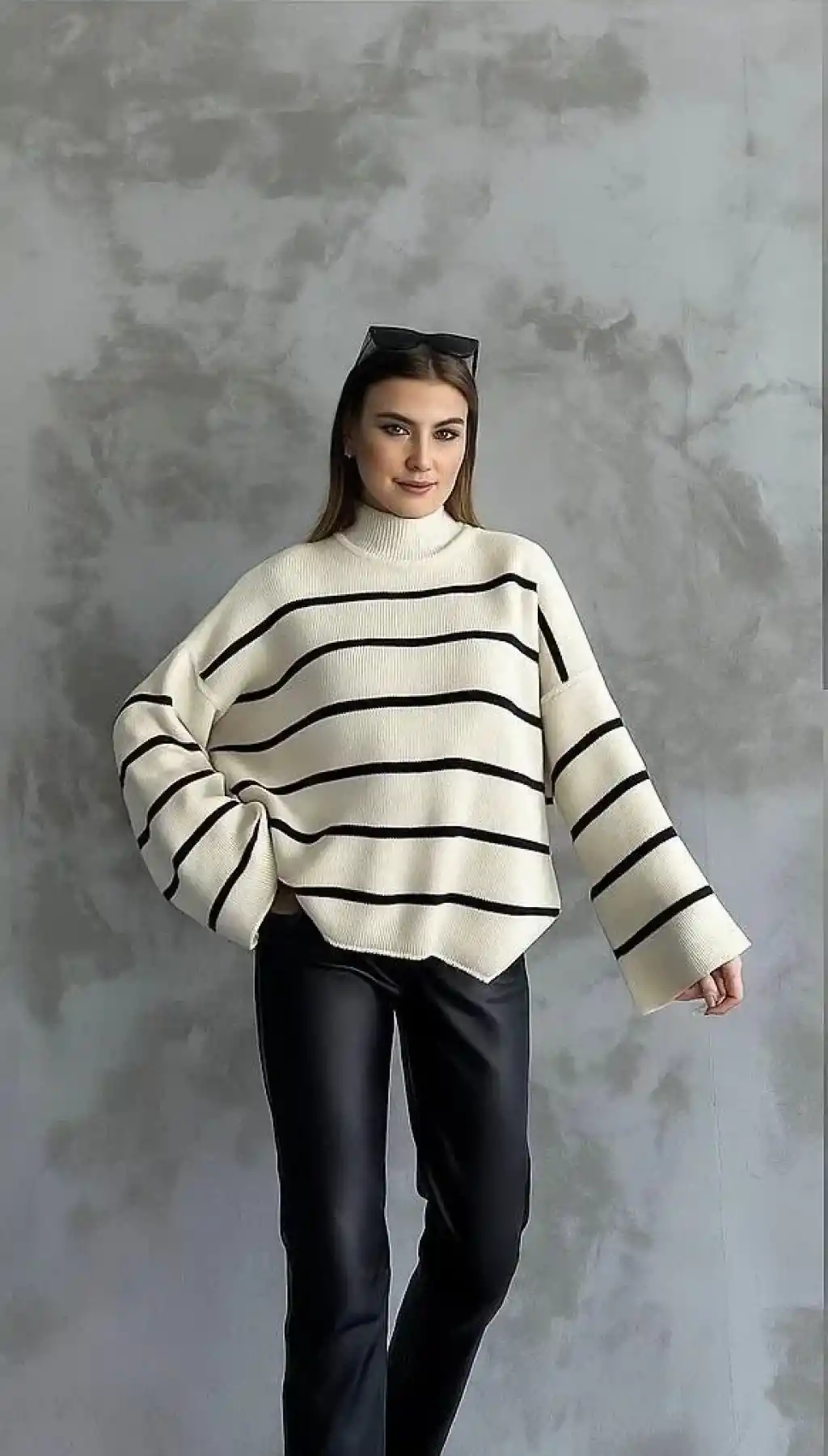 Çizgili ispanyol kol triko boğazlı kazak beyaz elf
