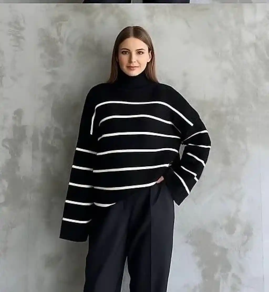 Çizgili ispanyol kol triko boğazlı kazak siyah elf