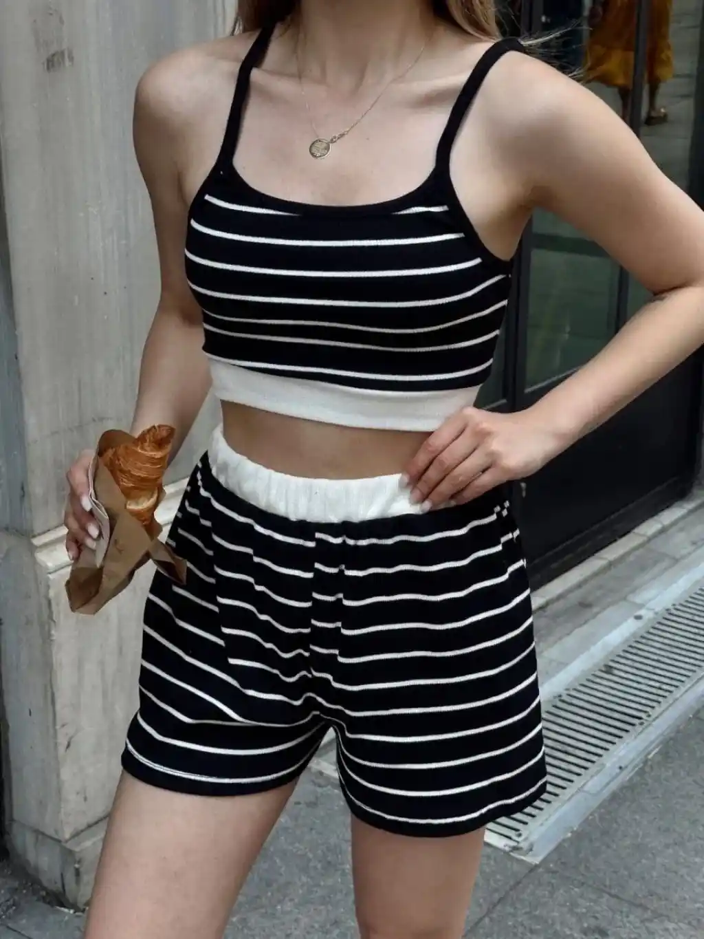 Şıklığı ve rahatlığı aynı anda sunan çizgili şortlu takım siyah s3978, gardırobunuzu tamamlayacak bir parça.