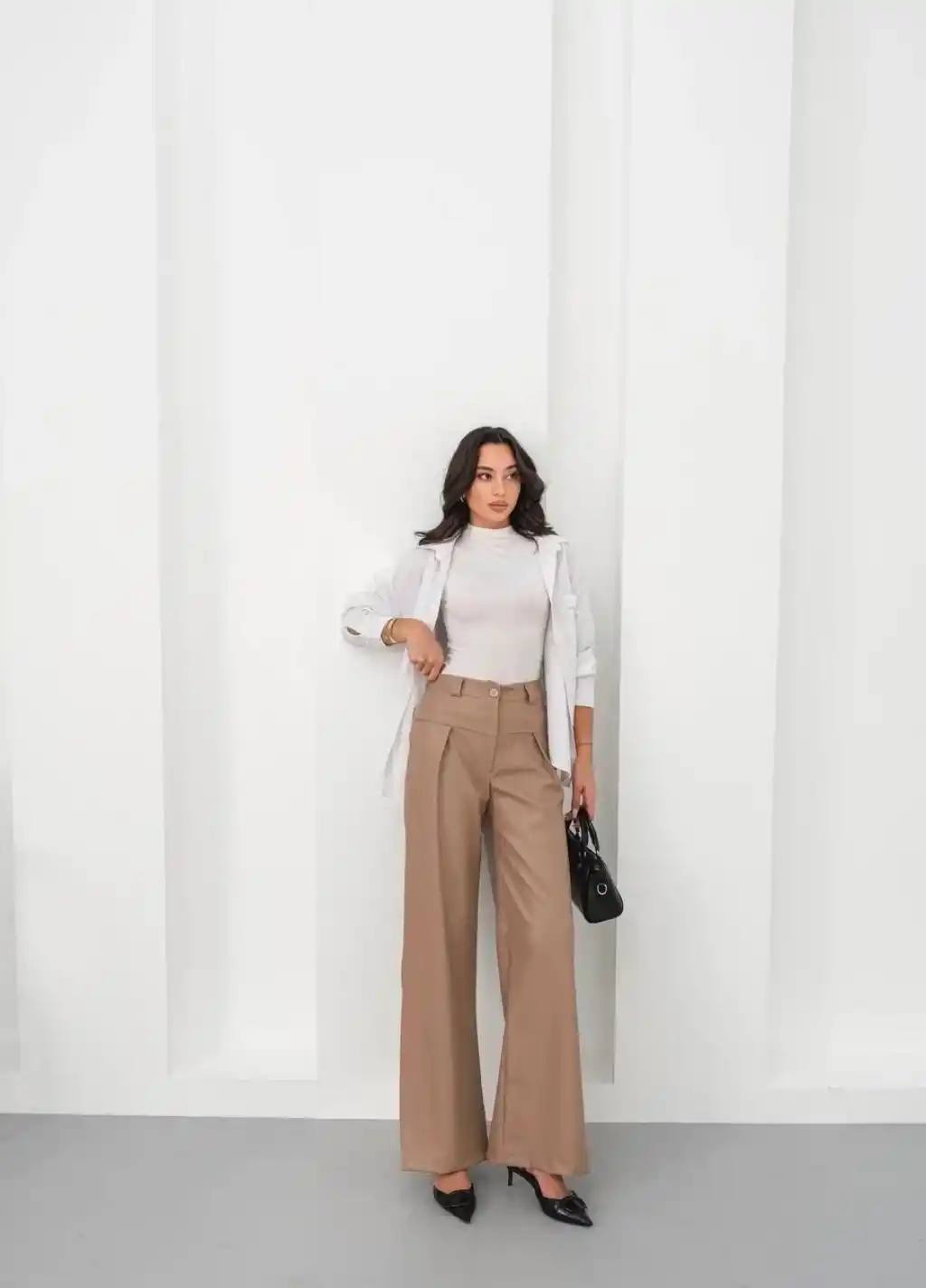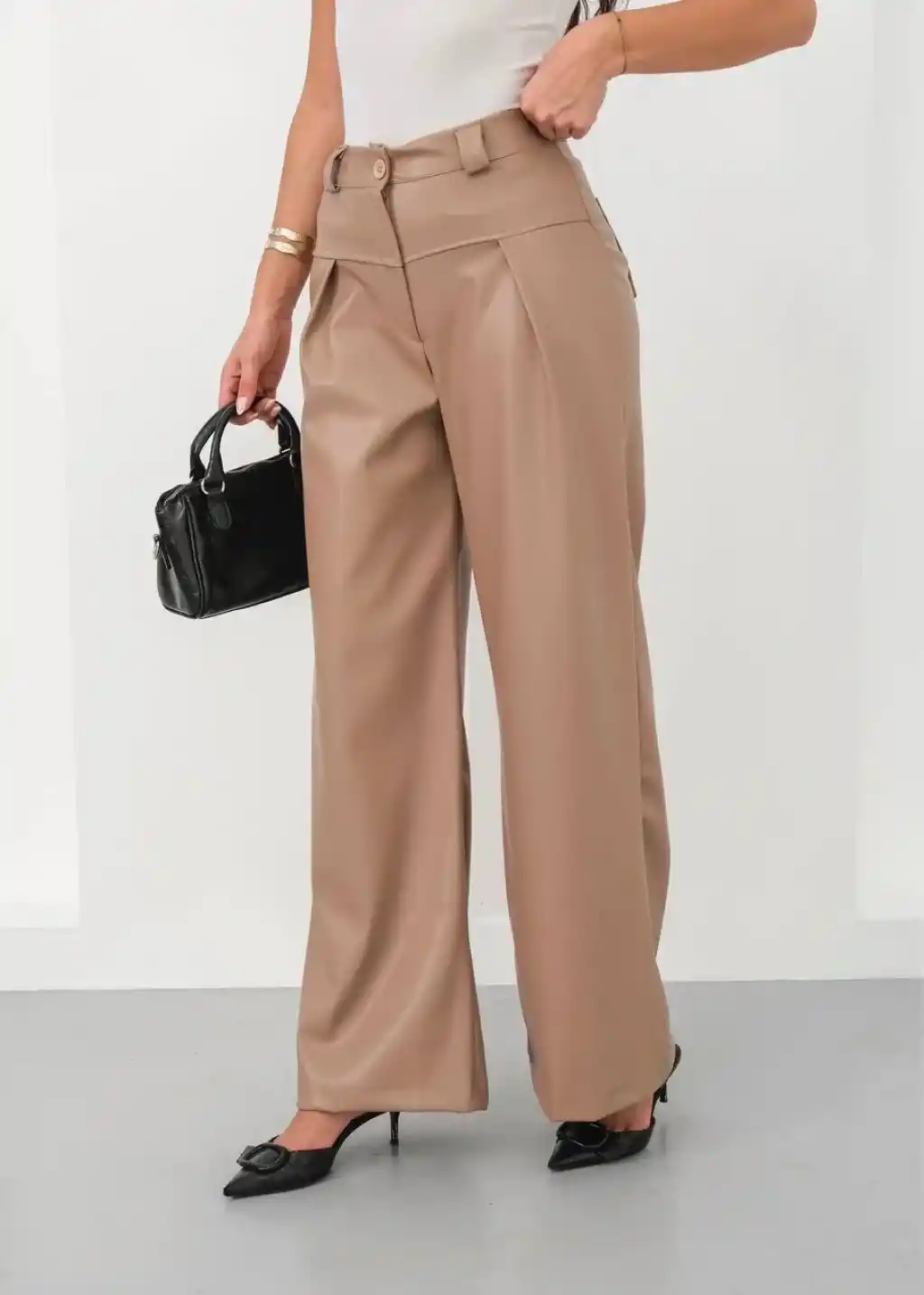 İspanyol yırtmaçlı paça deri pantolon bej hn