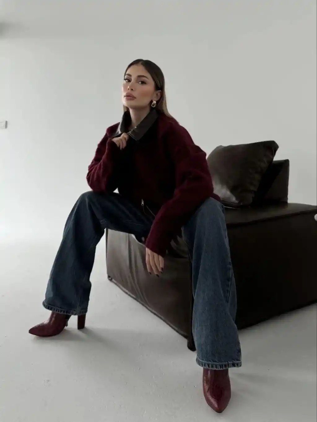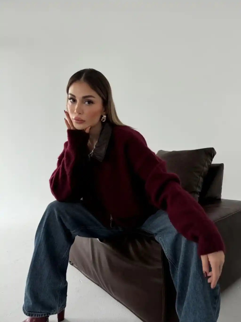 Deri Yakalı Pamuk dokulu Çift Taraflı Çalışan Fermuar Ceket - Bordo