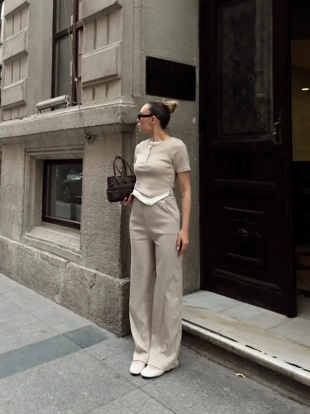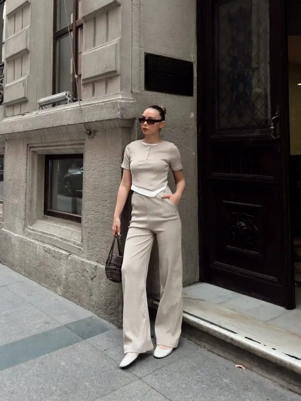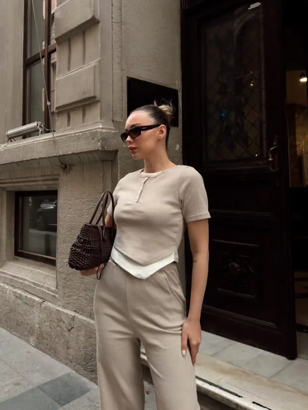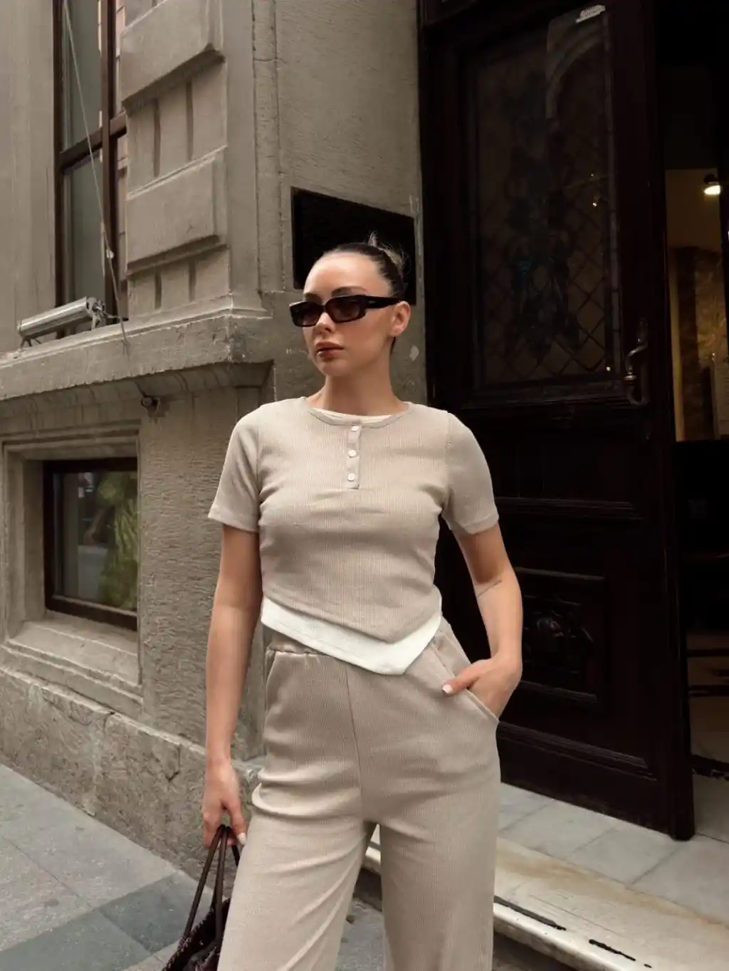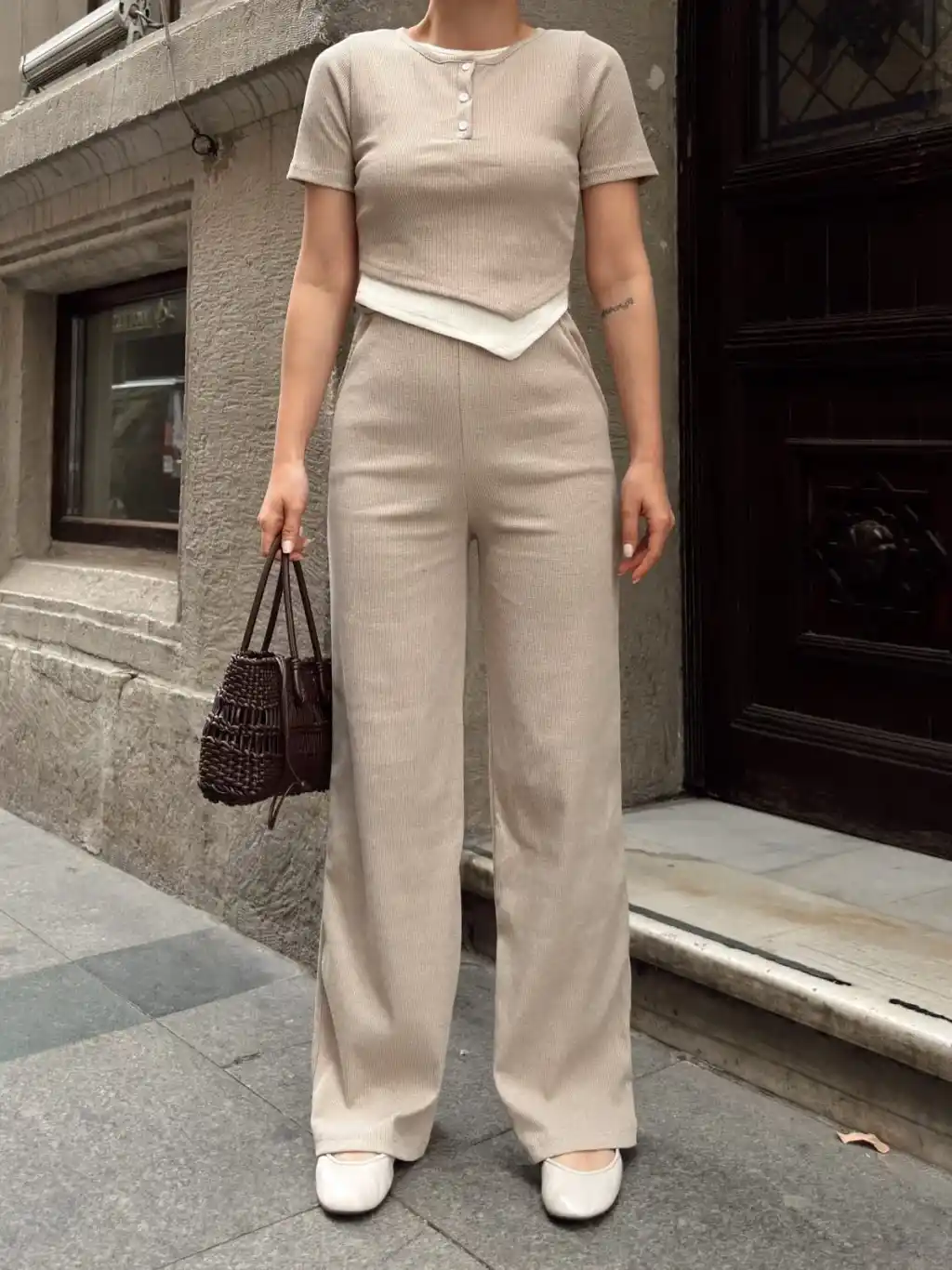 Şıklığı ve konforu bir arada arayan kadınların tercihi olan Düğme Yakalı Bej Alt Üst Takım S3943, her tarza uyum sağlar.