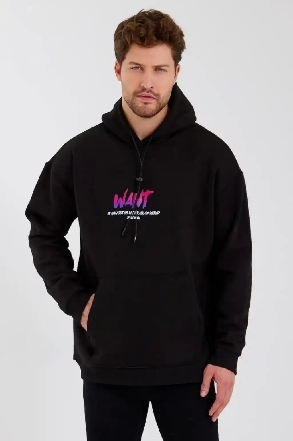 Erkek Baskılı Üç İplik Kapüşonlu Oversize Sweatshirt - Siyah