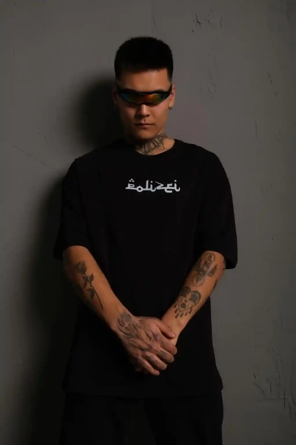Erkek Bisiklet Yakalı Sırt Baskılı Oversize T-Shirt - Siyah