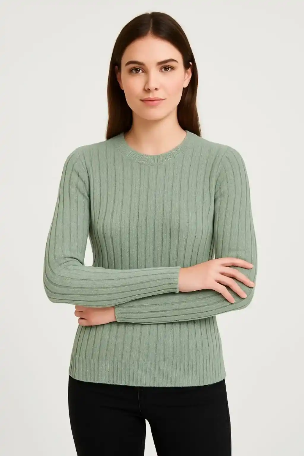 Erkek Bisiklet Yuvarlak Yaka Triko Kazak Pamuklu Kalın Fitilli Dokuma, Regular Fit Uzun Kollu Kışlık Model - Mint Yeşili