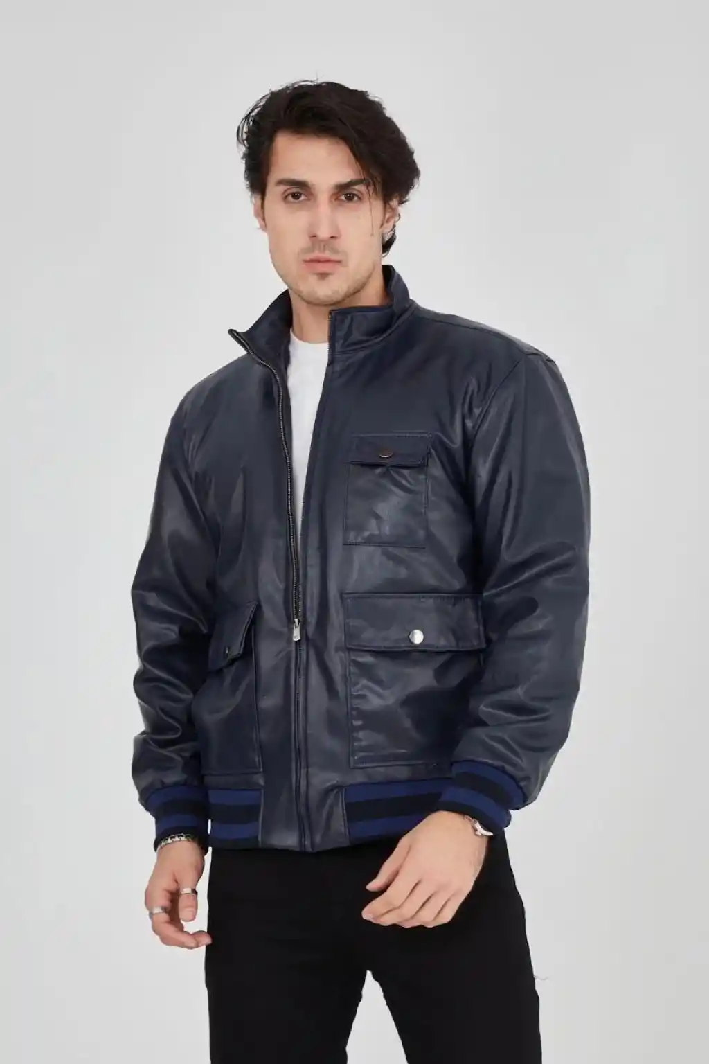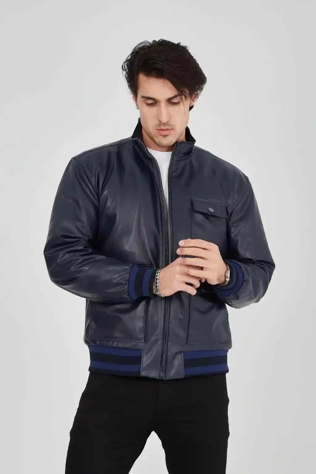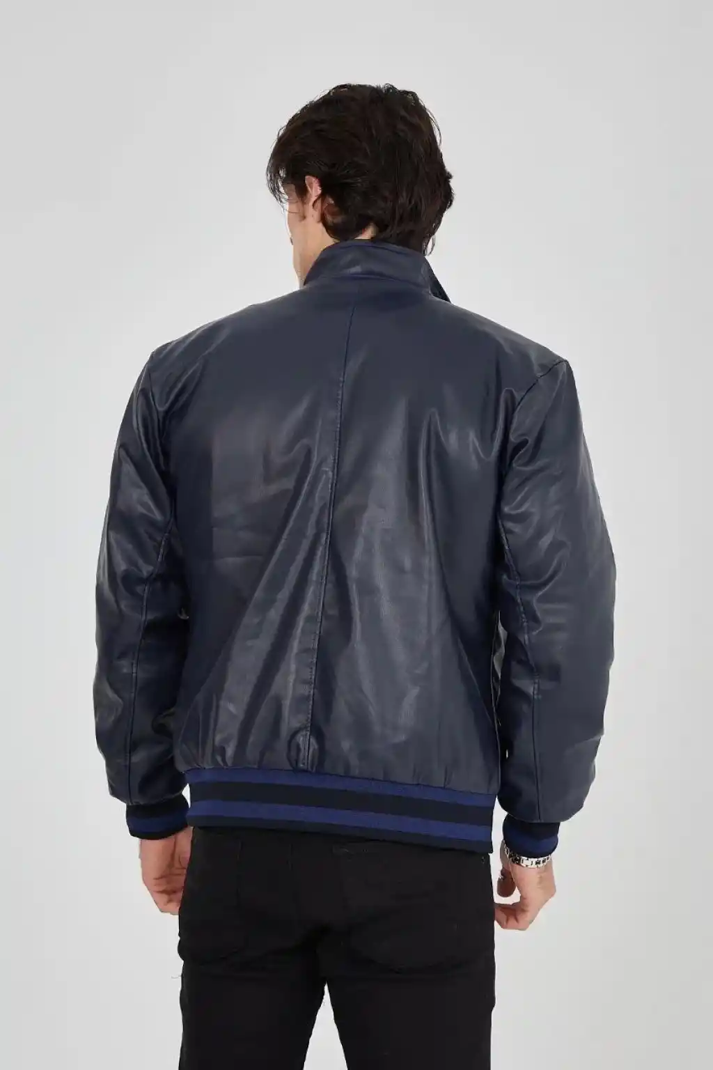Erkek Fermuarlı İçten Elyaf ve Astarlı Suni Deri Ceket - Lacivert