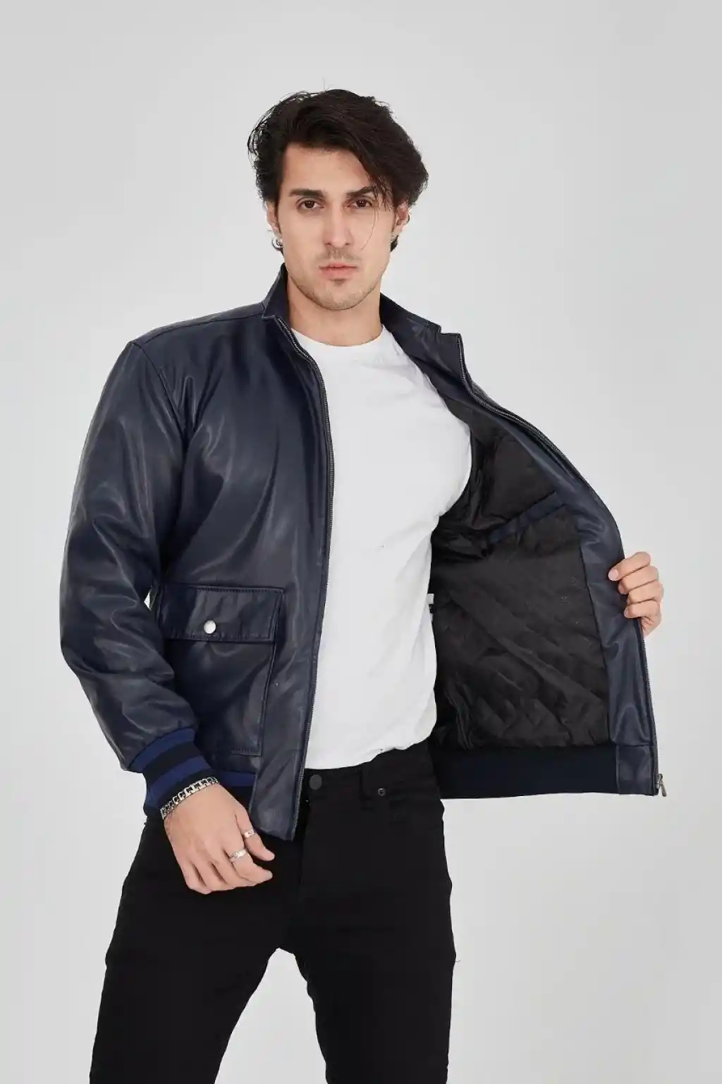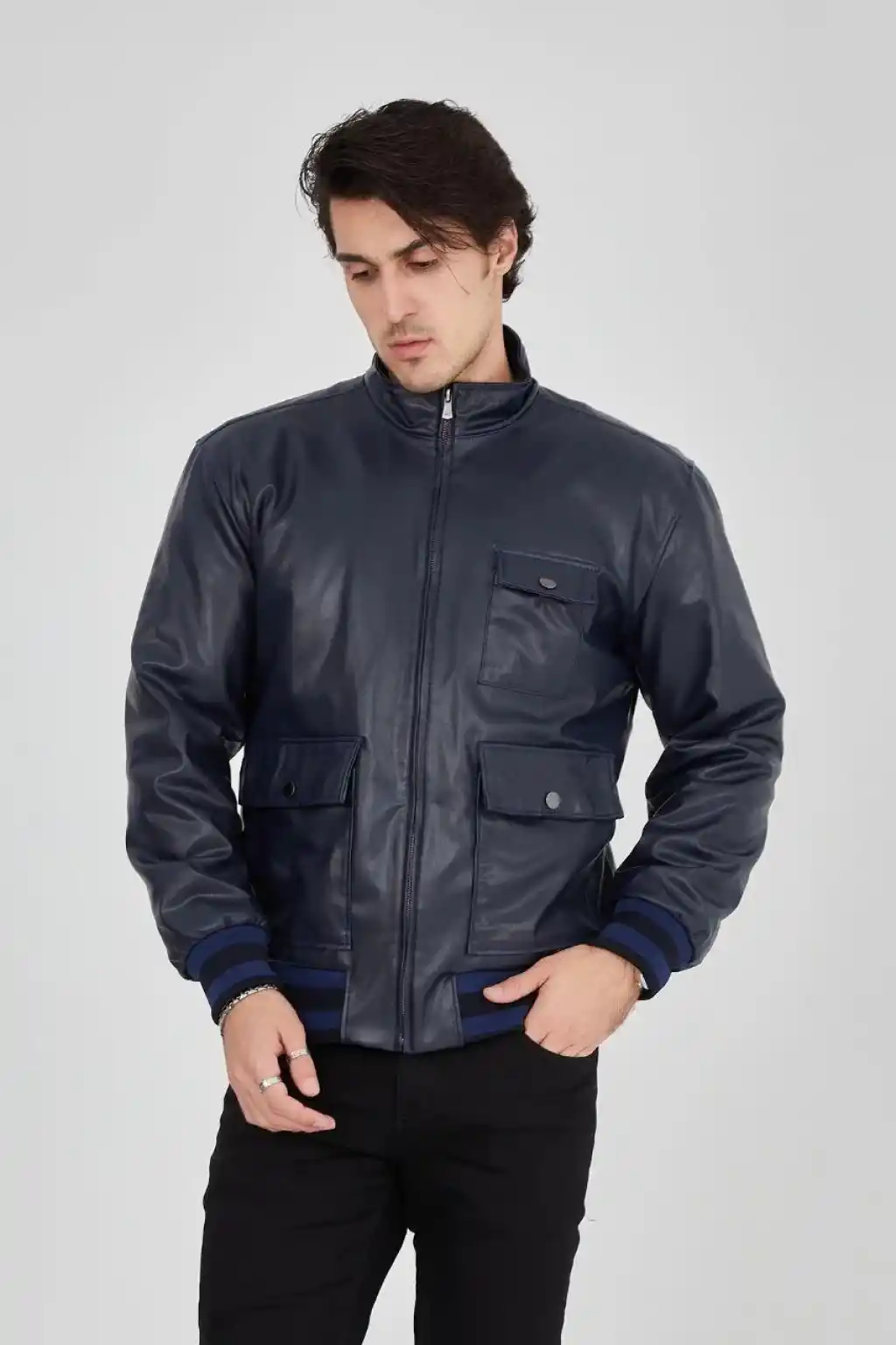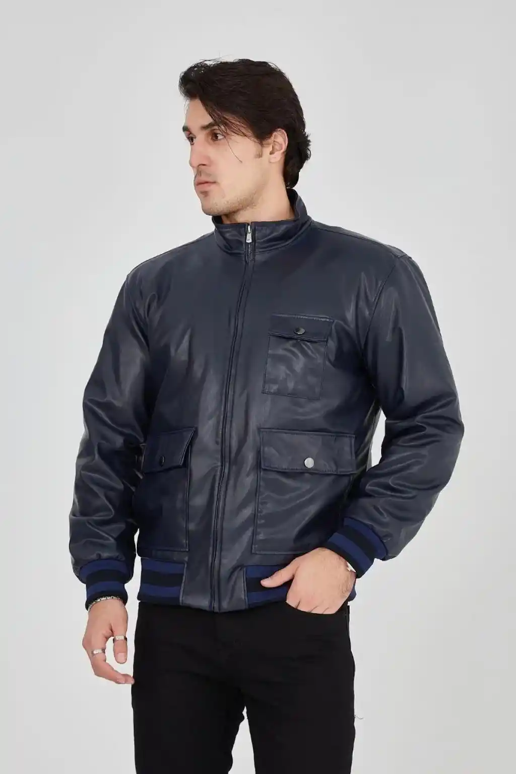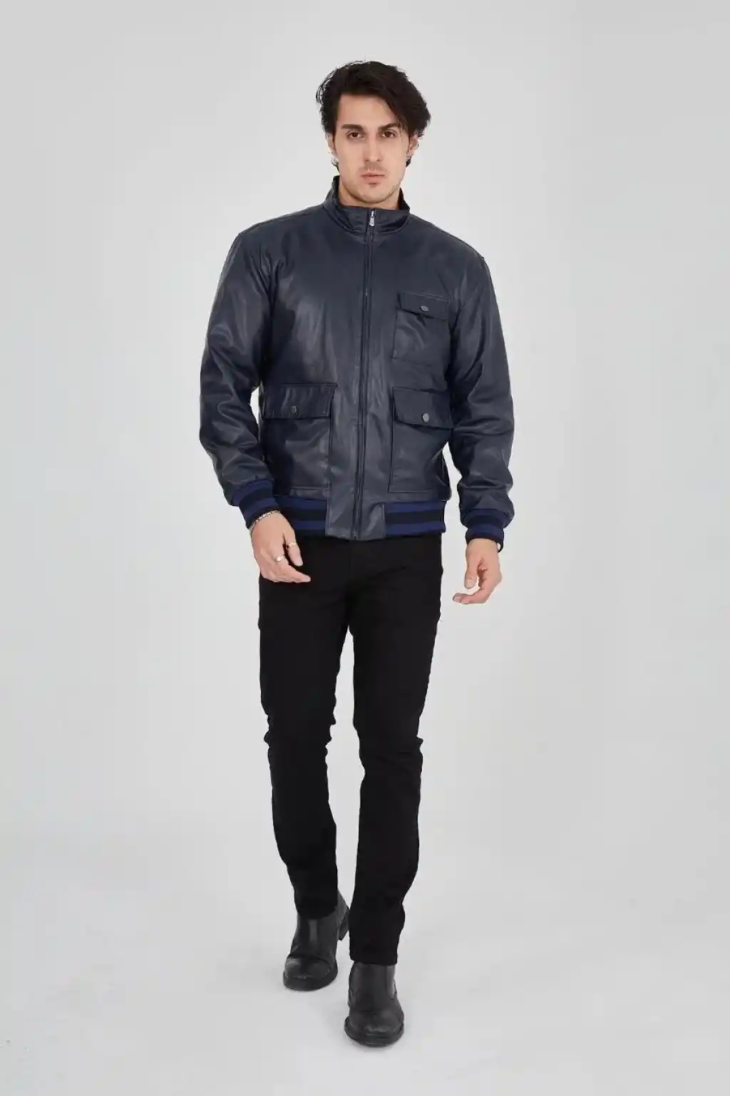 Erkek Fermuarlı İçten Elyaf ve Astarlı Suni Deri Ceket - Lacivert