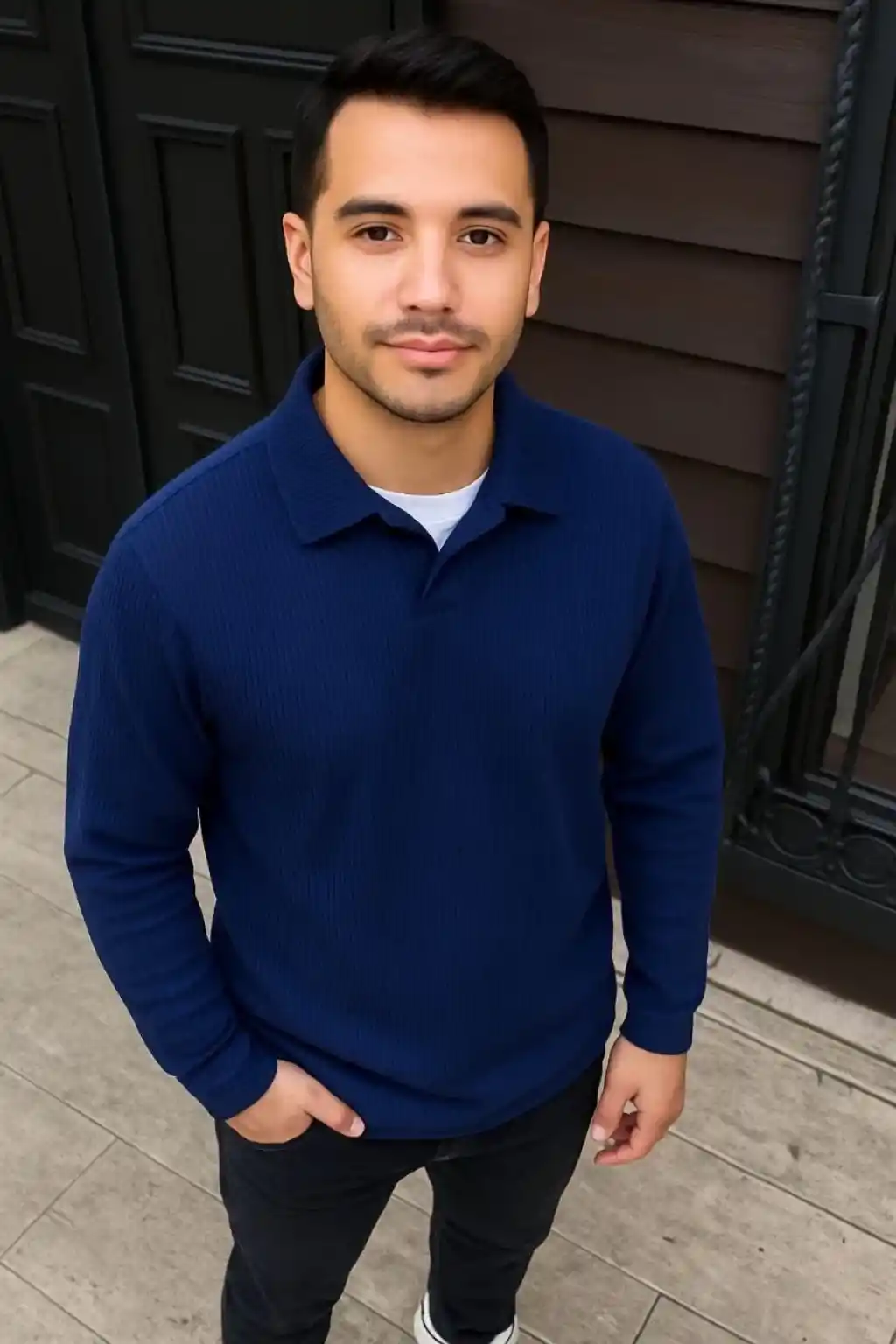 Erkek Fitilli Polar Sweatshirt – Düğmesiz Polo Yaka, Oversize Rahat Kalıp, Kalın Polar Kumaş, Kışlık ve Baharlık Şık Günlük Üst - Lacivert