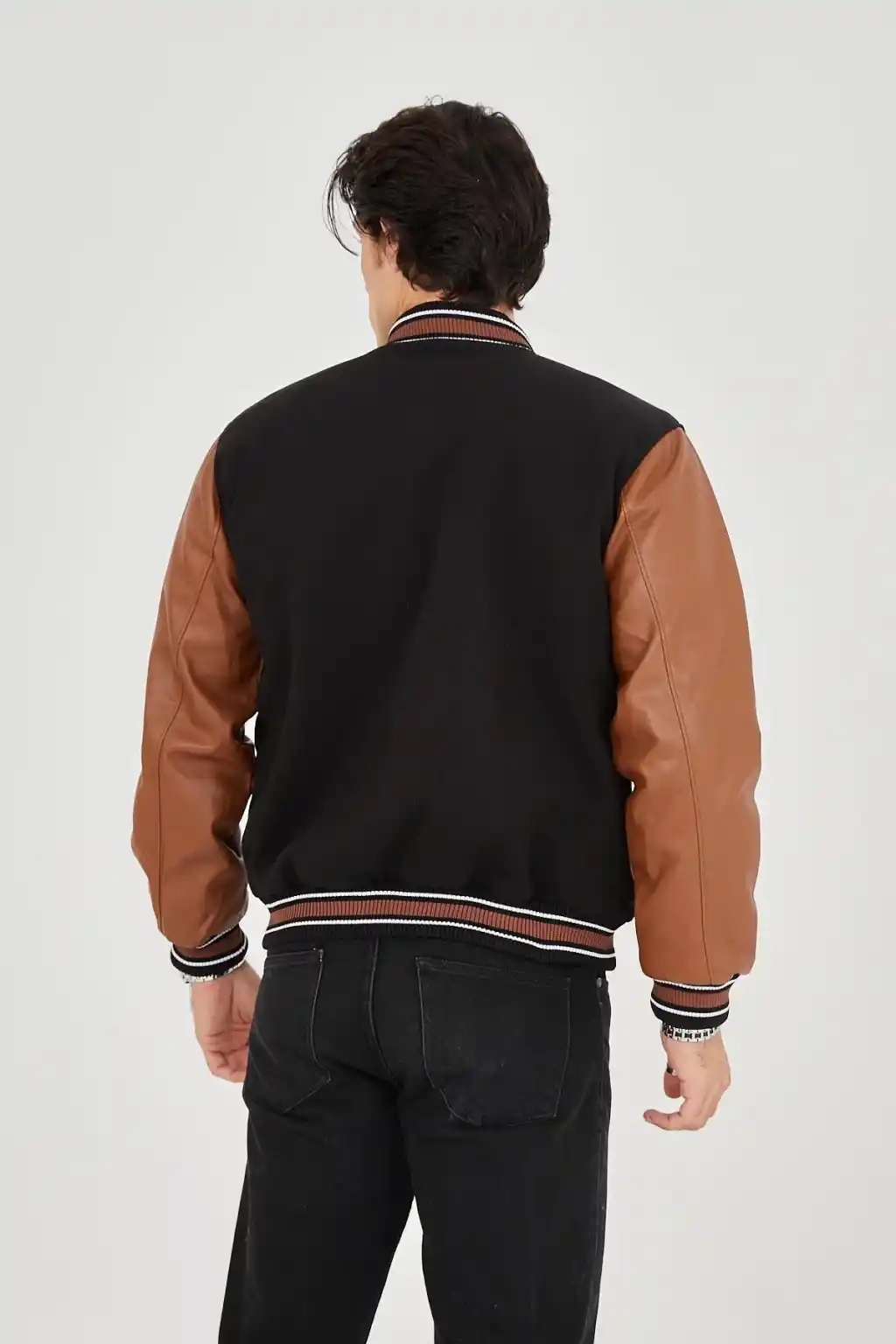 Erkek İçten Elyaf ve Astarlı Kolları Suni Deri Ceket - Kahverengi