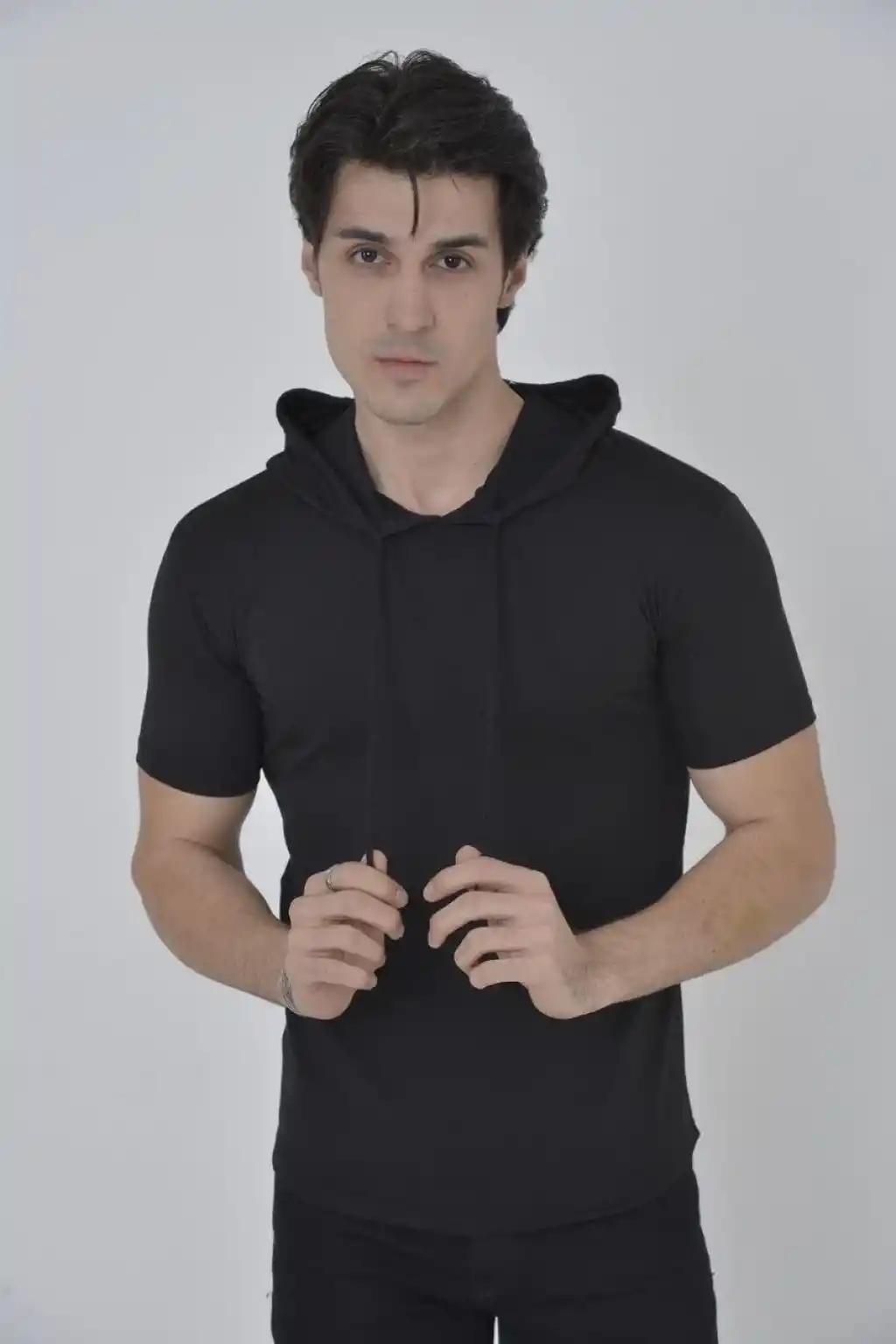 Erkek Kapşonlu Slim Fit T-shirt - Siyah
