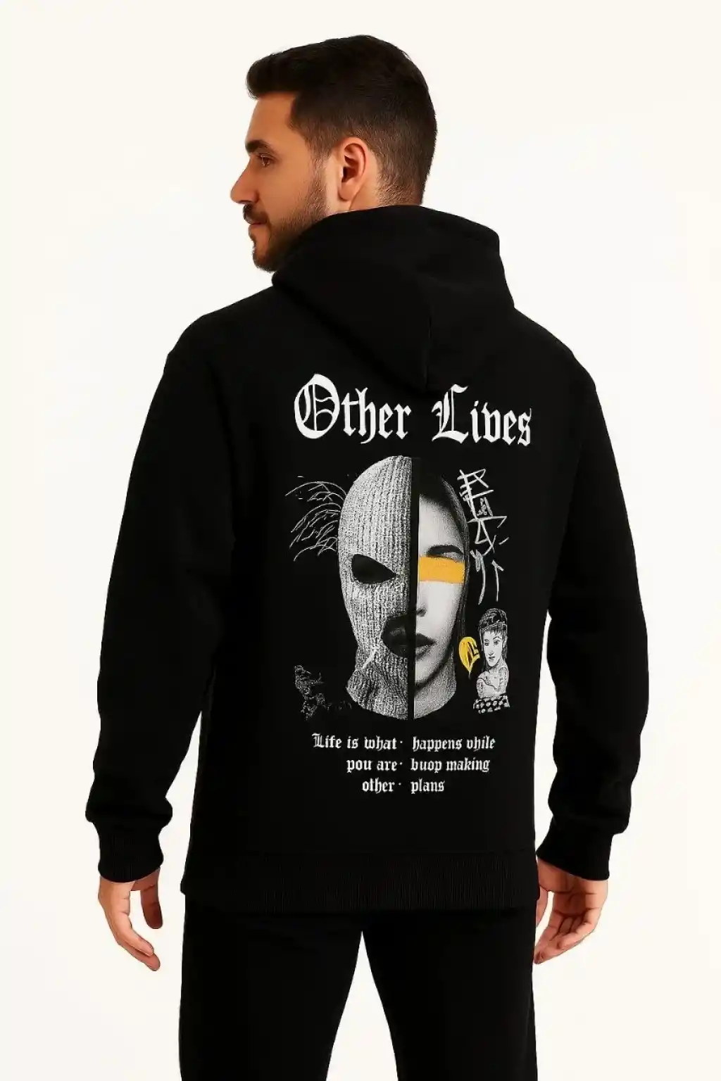 Erkek Kapşonlu Sweatshirt – Oversize Üç İplik Şardonlu Hoodie, “Other Lives” Ön & Arka Baskılı, Kanguru Cepli, Kışlık Rahat Günlük Stil - Siyah