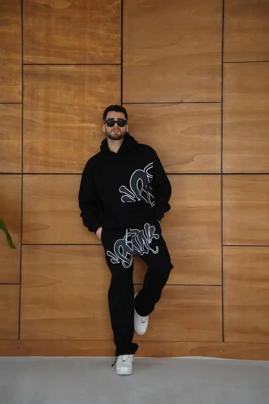 Erkek Kapüşonlu Eşofman Takım Graffiti Baskılı Oversize Rahat Kalıp, Kanguru Cepli, Streetwear Tarzında Premium Ürün 3 iplik Pamuklu - Siyah