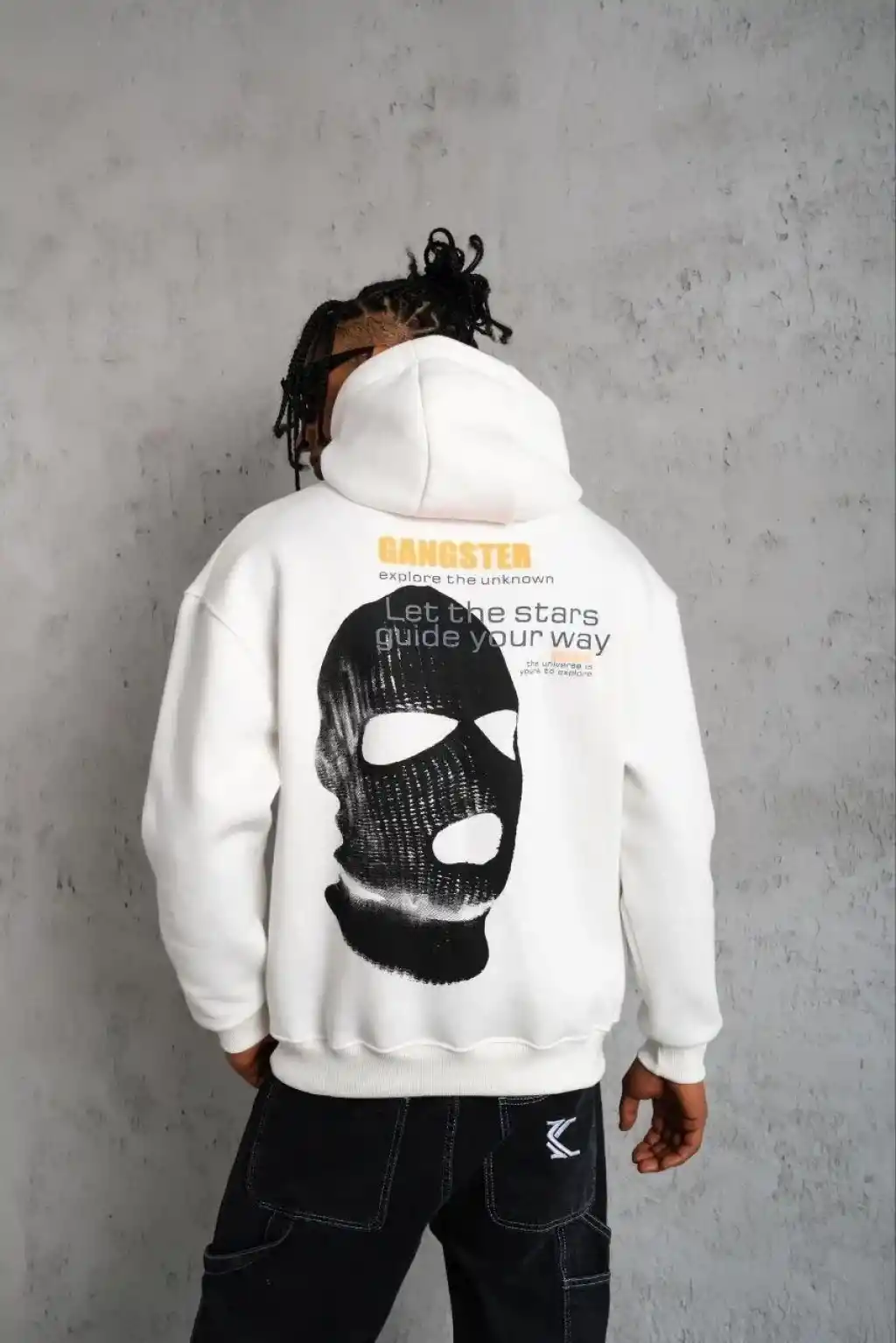 Erkek Kordonlu Maske Baskılı Kapüşonlu Sweat - Beyaz
