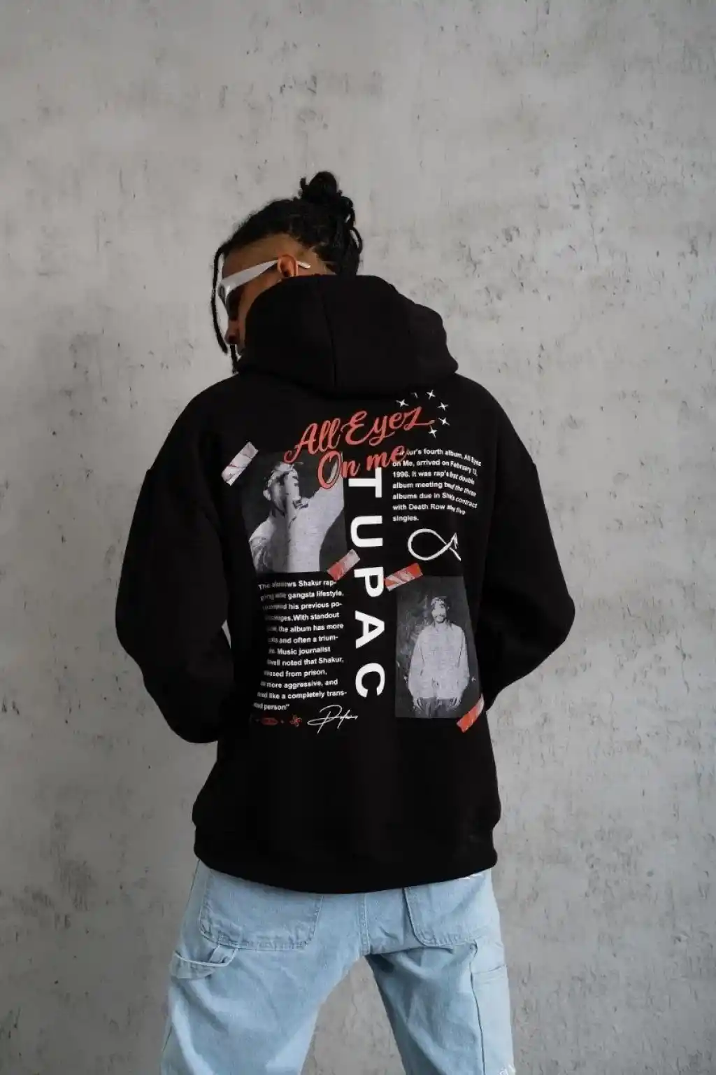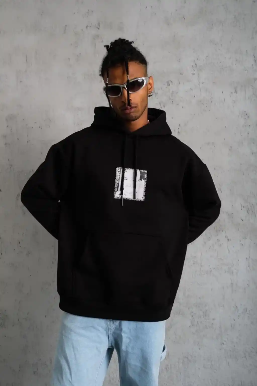 Erkek Ön Arka Baskılı Kapşonlu Sweat - Siyah