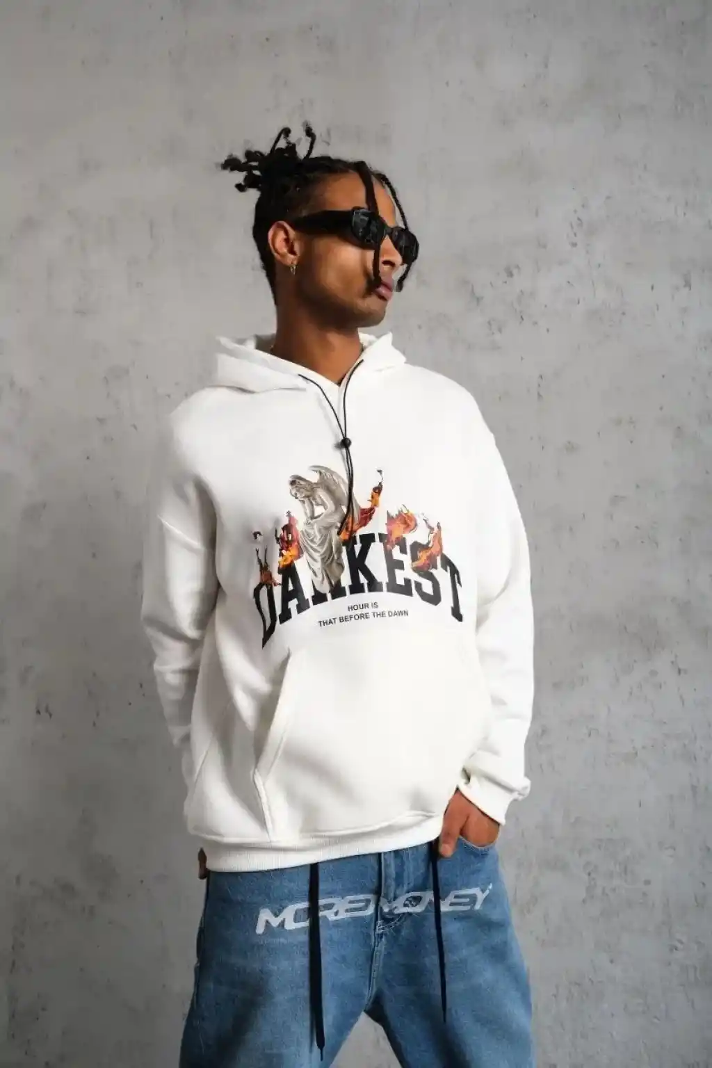Erkek Oversize Kapüşonlu Sweatshirt – Beyaz Renk Üç İplik İçi Pamuklu Kanguru Cepli Baskılı Hoodie Rahat Kalıp Kışlık Günlük Kombinlere Uygun - Beyaz