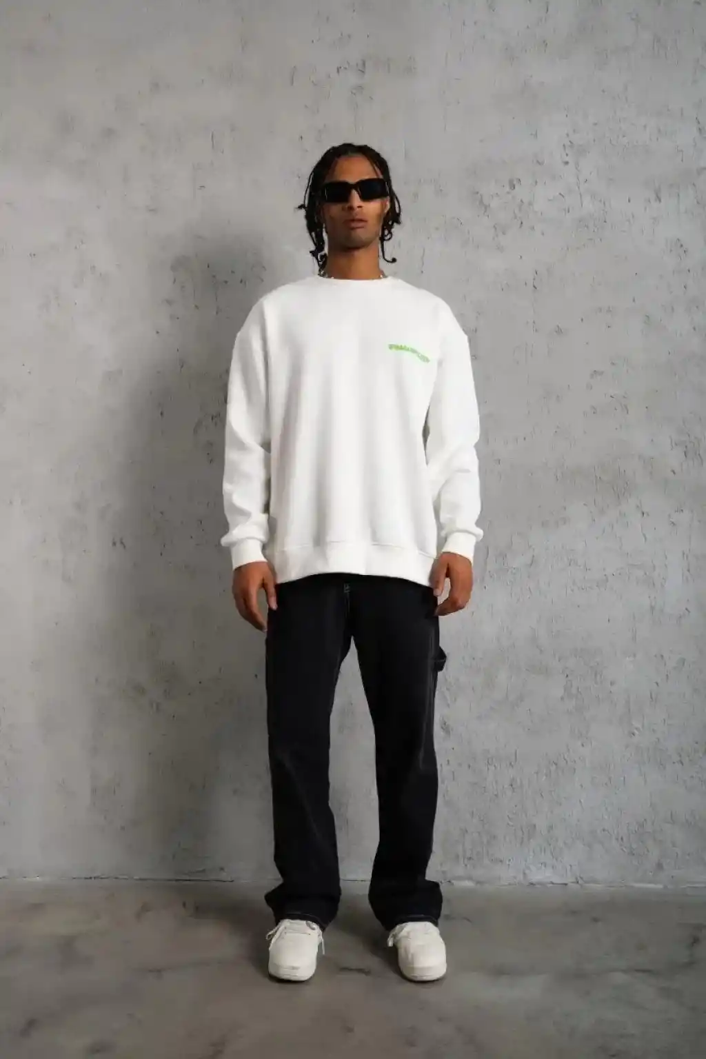 Erkek Oversize Sweatshirt – Beyaz Renk | Ön ve Sırt Baskılı, Üç İplik İçi Pamuklu Kumaş, Rahat Kalıp, Ribanalı Kışlık Sweat | Winagain Polizei Serisi - Beyaz