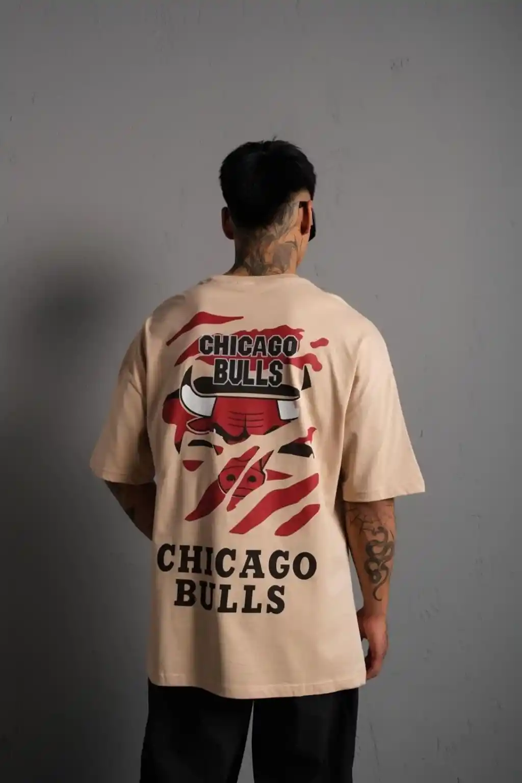 Erkek Sırt Baskılı A Kalite Oversize T-shirt - Bej