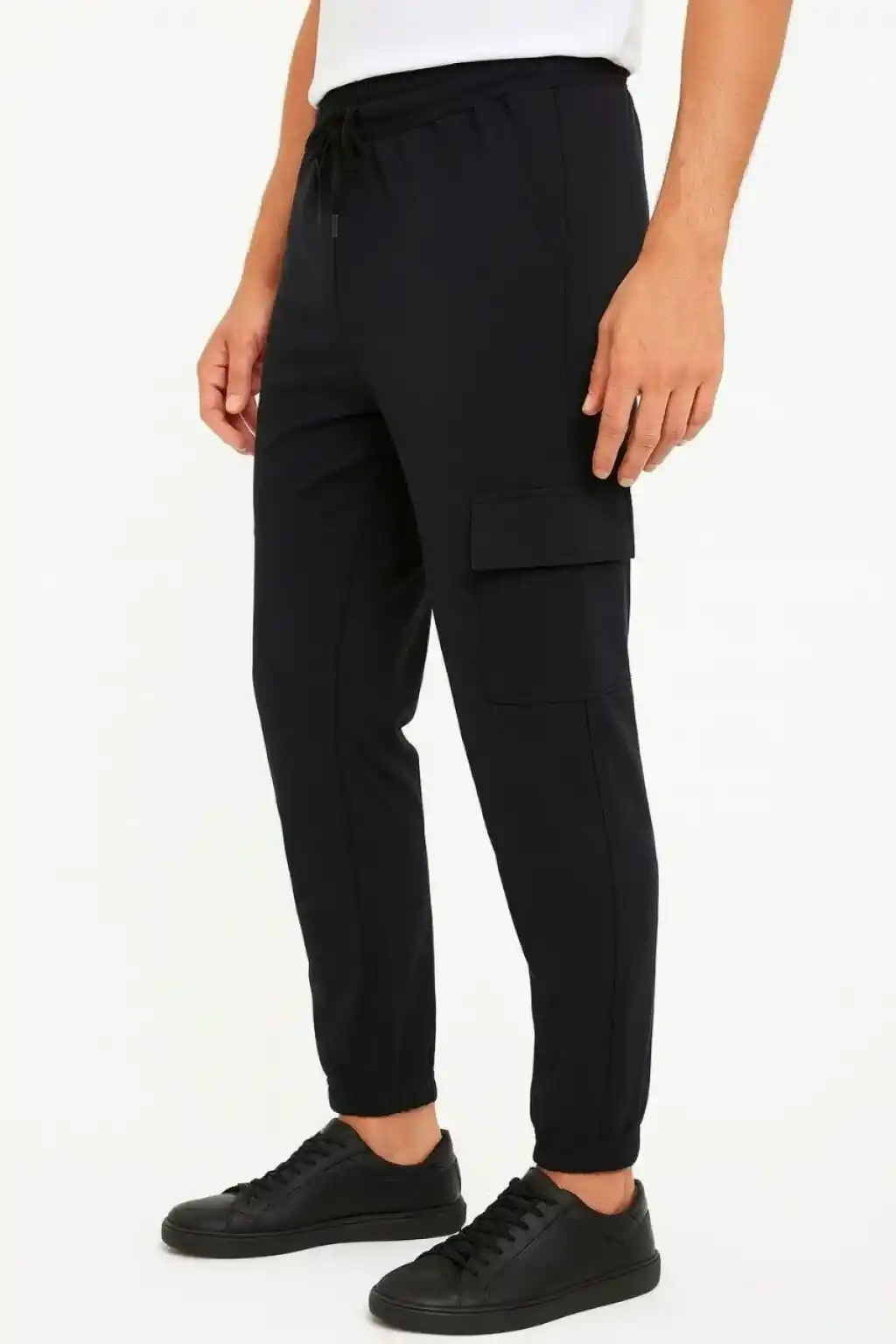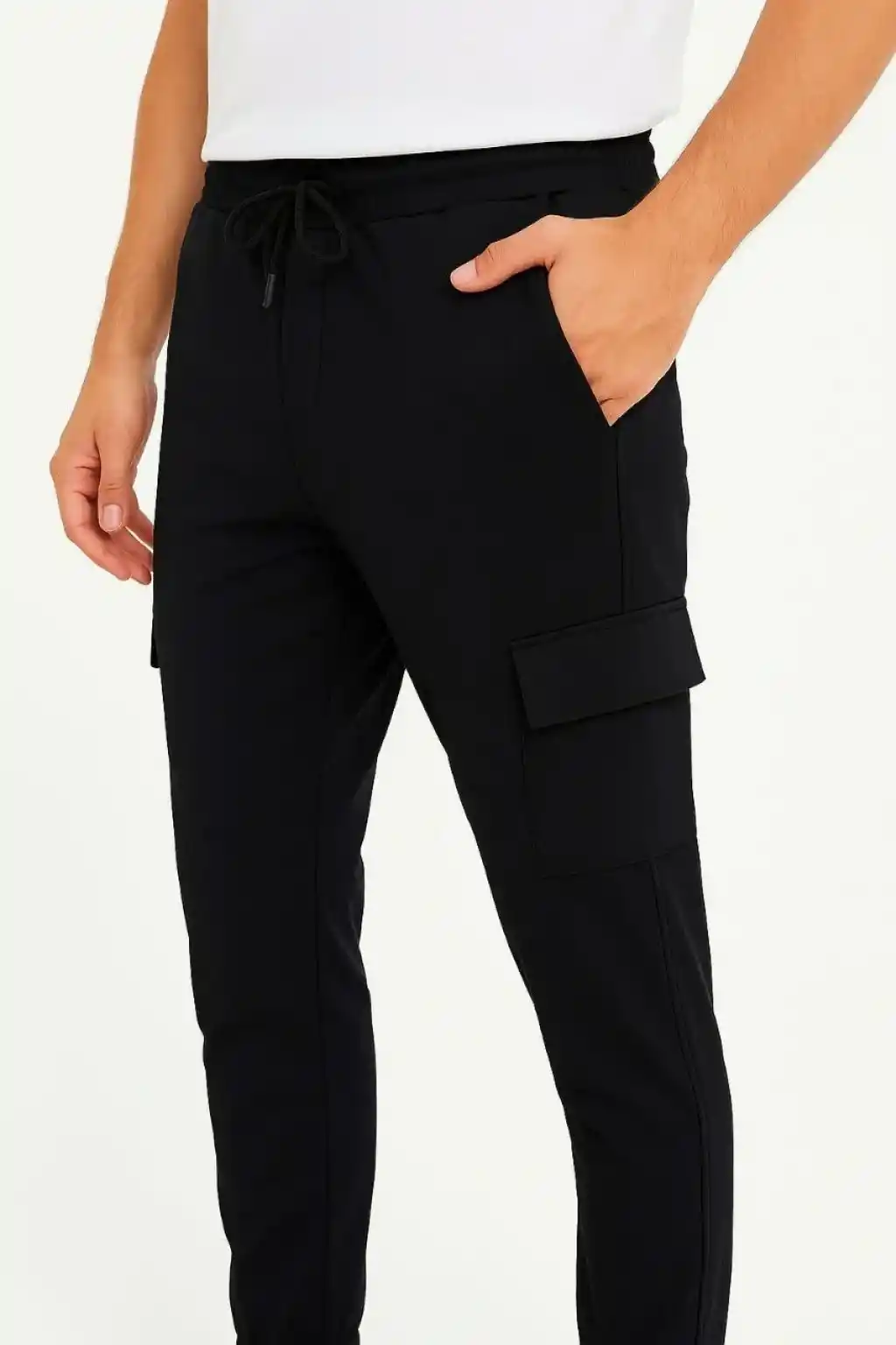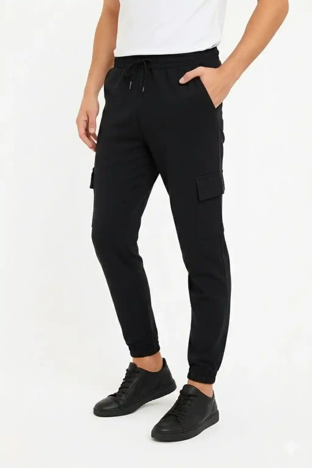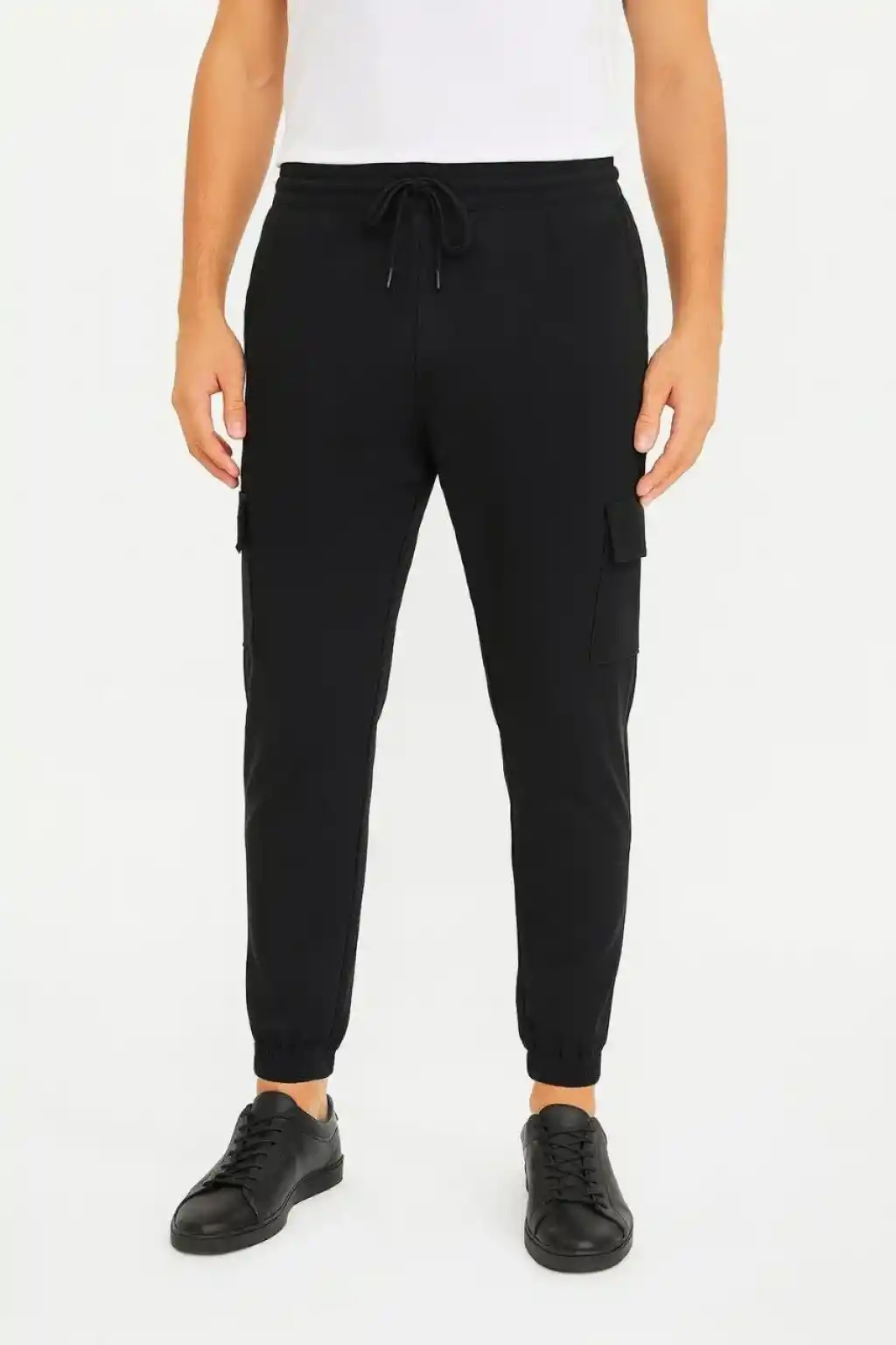 Erkek Siyah Jogger Eşofman Altı Rahat Kalıp, Kargo Cepli, Lastikli Paça, Günlük Spor Pantolon - Siyah