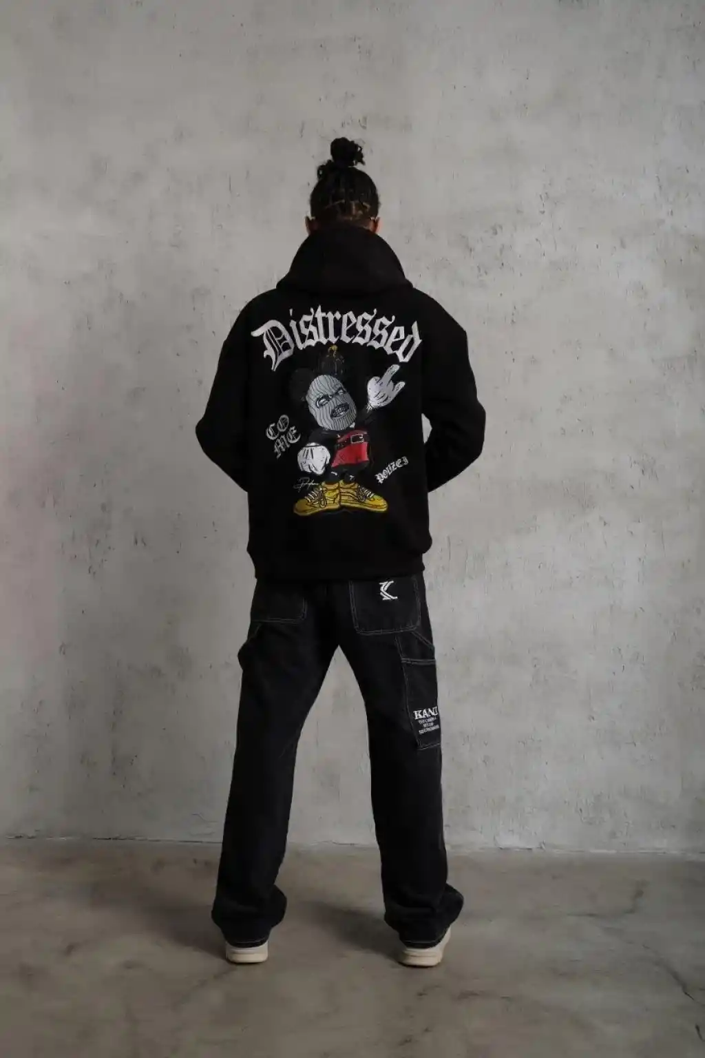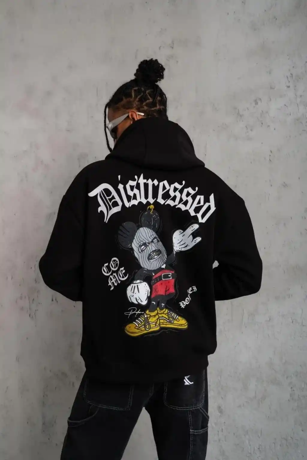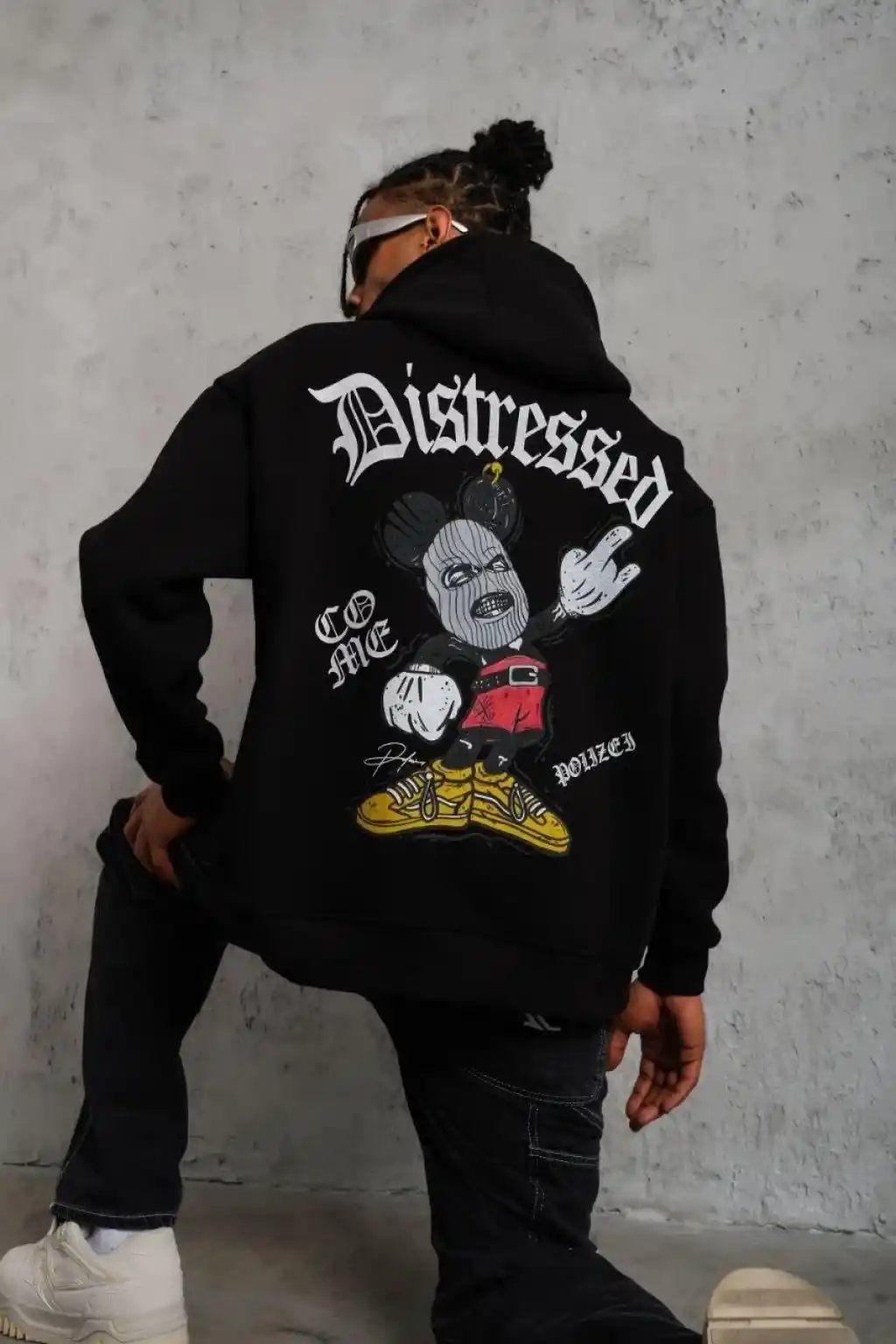 Erkek Üç İplik Baskılı Kapüşonlu Sweat - Siyah