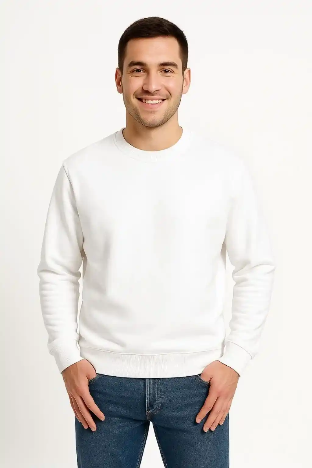 Erkek Üç İplik Düz Bisiklet Yaka SweatShirt - Beyaz