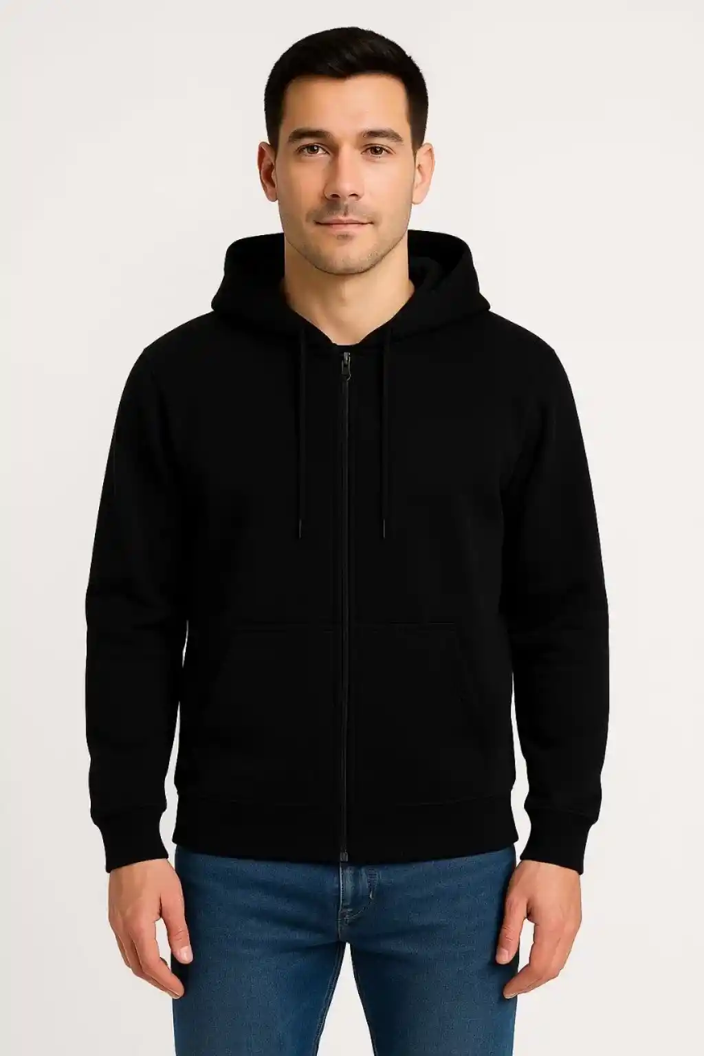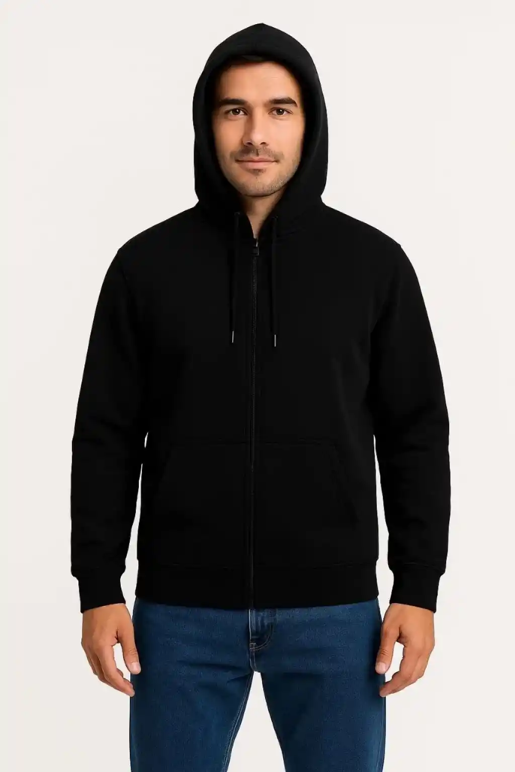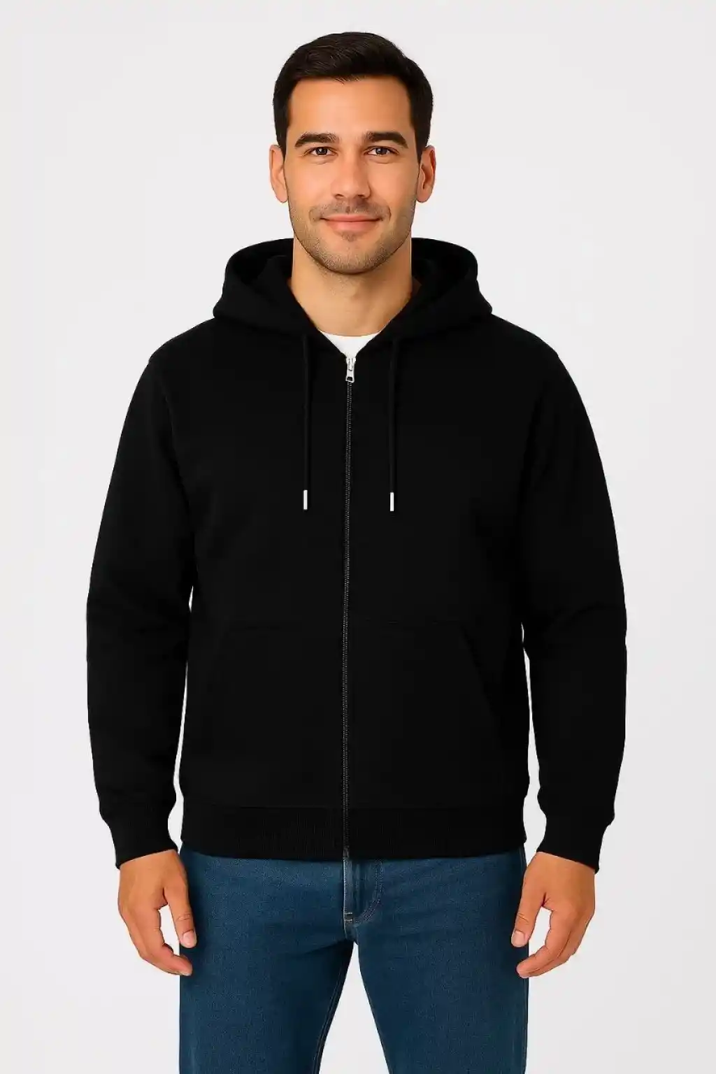 Erkek Üç İplik Kapüşonlu Tam Fermuarlı Kanguru Çepli SweatShirt Hoodie - Siyah