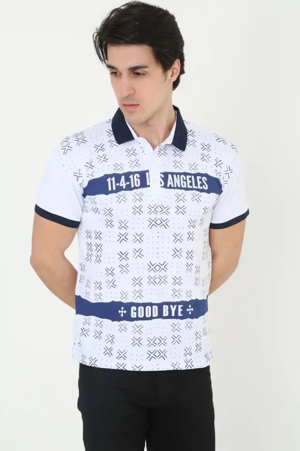 Erkek Yakalı Slim Fit Baskılı T-Shirt - Beyaz