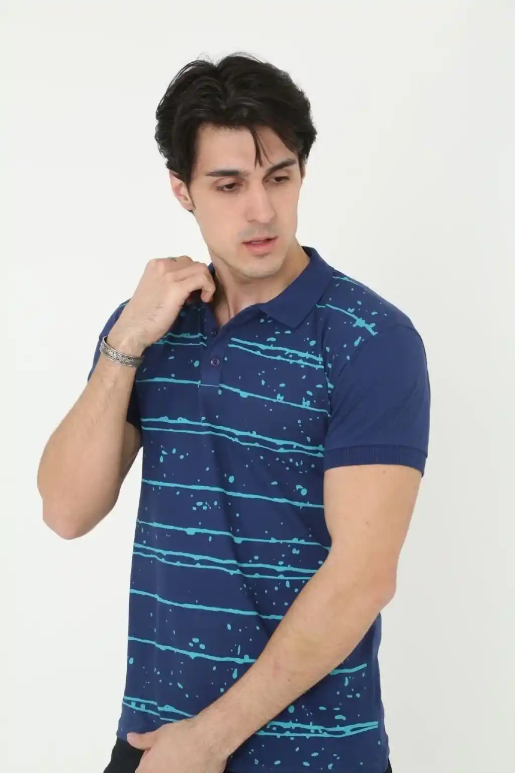 Erkek Yakalı Slim Fit Pike Çizgili T-Shirt - Mavi