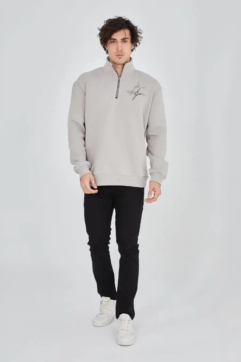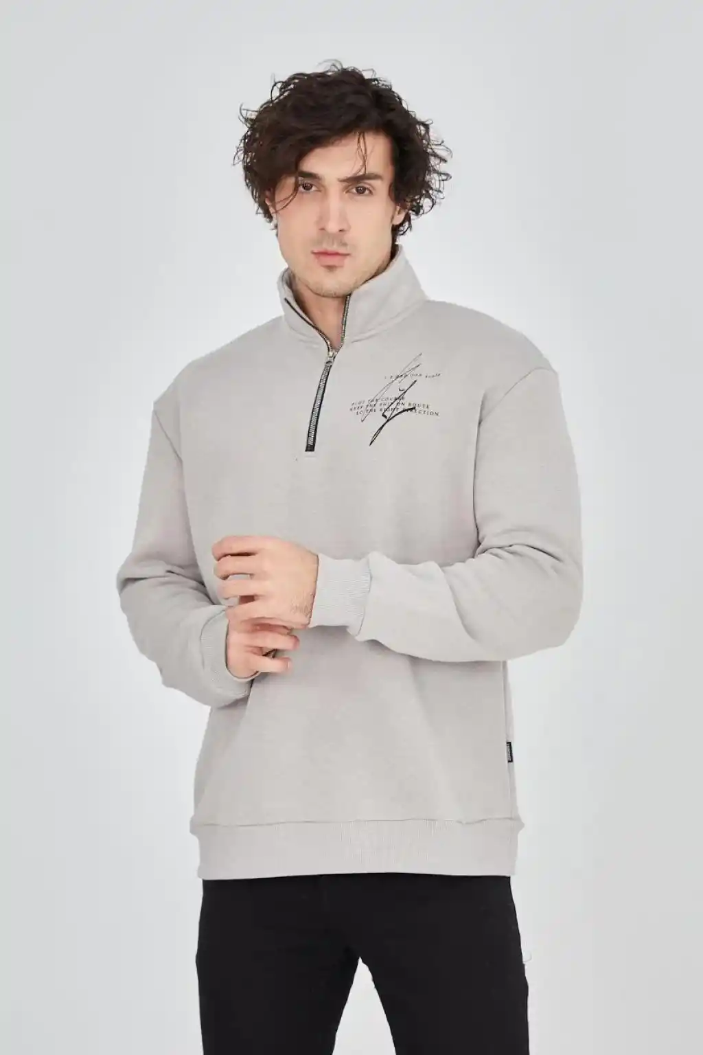 Erkek Yarım Fermuarlı Baskılı Sweat - Boyalı Gri