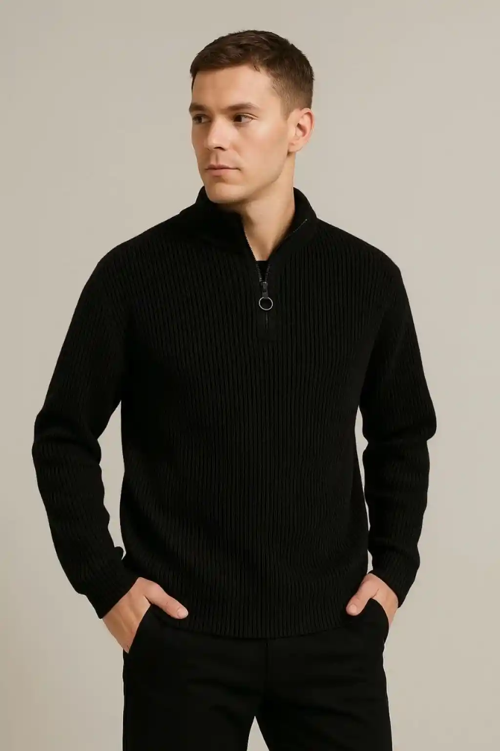 Erkek Yarım Fermuarlı Triko Kazak – Selanik Örgü, Dik Yaka, Pamuklu Dokuma, Regular Fit Uzun Kollu Kışlık Model - Siyah