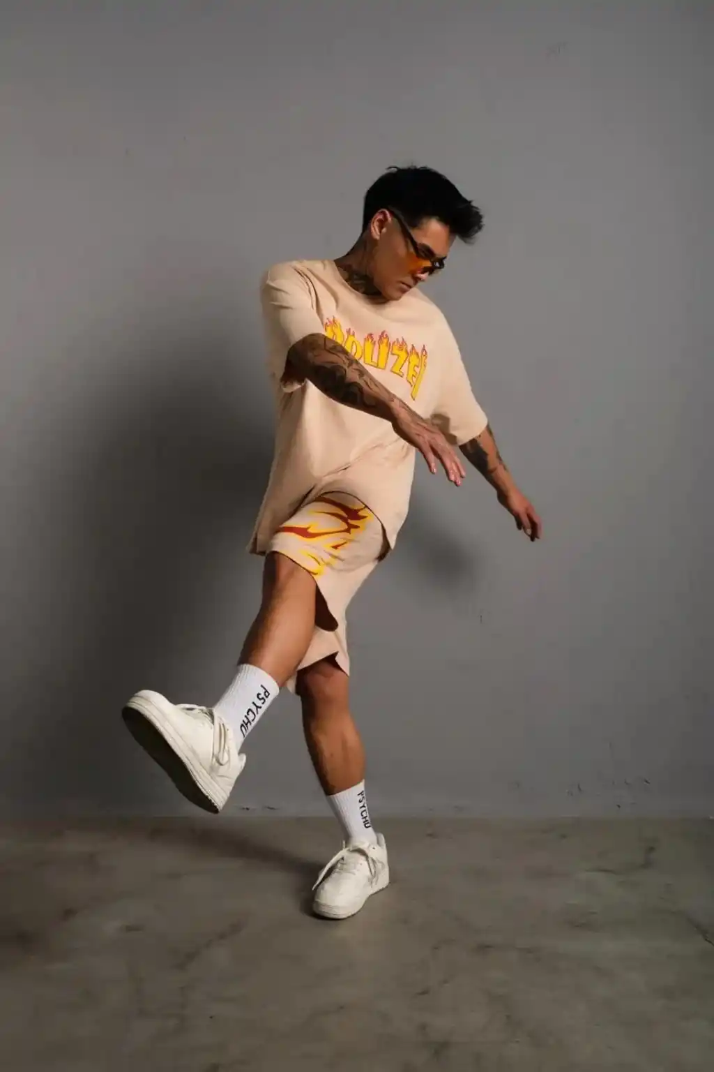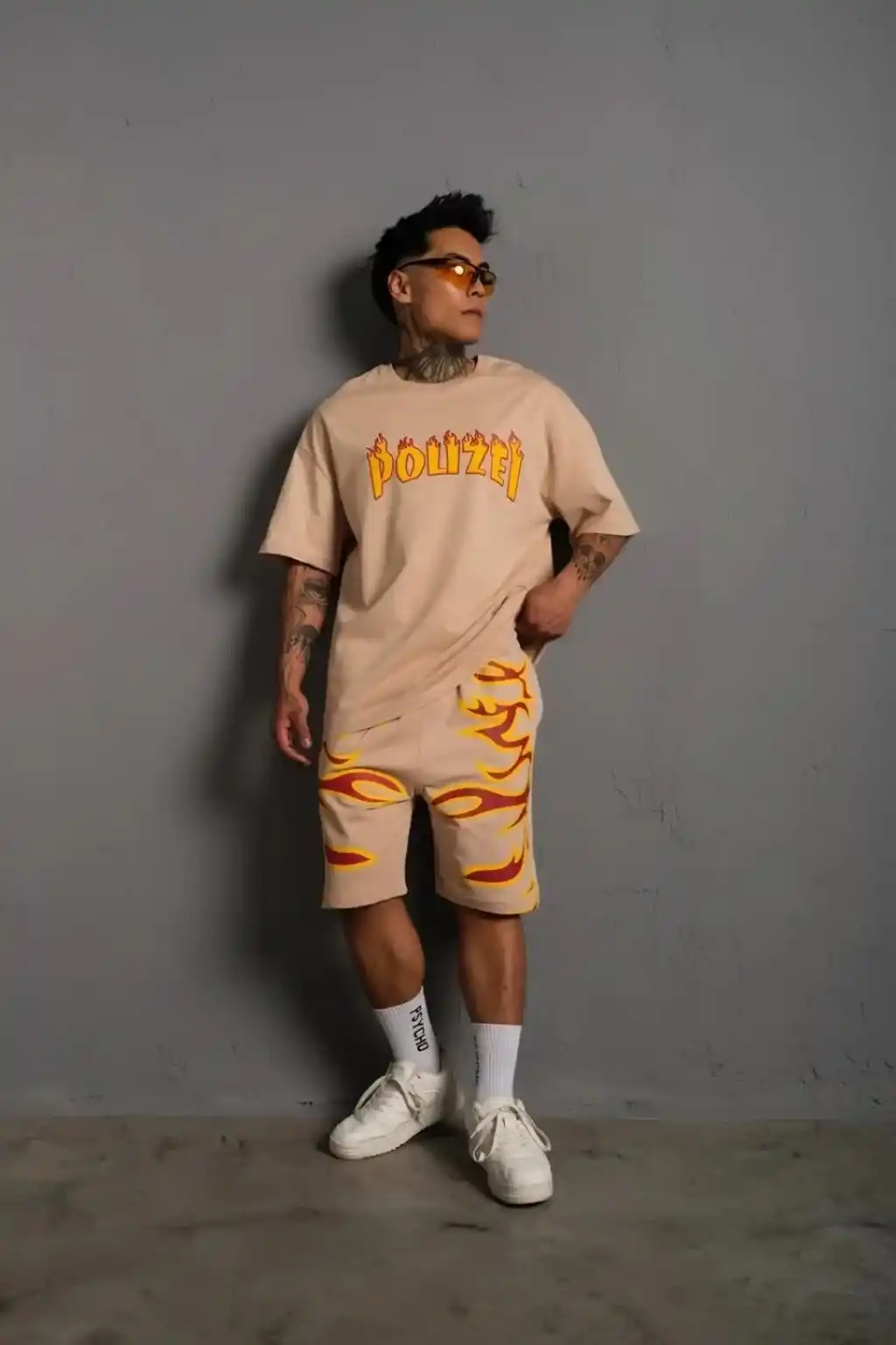 Erkek Alev Baskılı İkili Şortlu Takım - Bej
