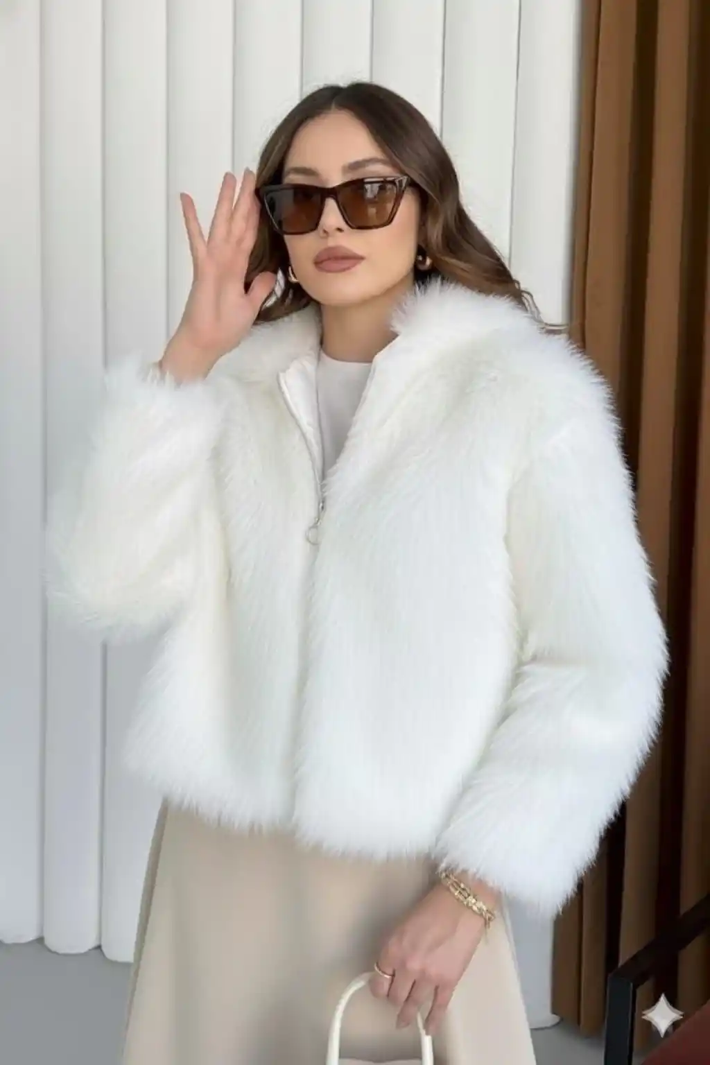 Beyaz rengi ve şık tasarımıyla dikkat çeken fermuarlı kısa kürk, soğuk havalarda hem sizi sıcak tutacak hem de şıklığınızı tamamlayacak bir seçenektir. Kürk detaylarıyla zarif bir görünüm sunan bu kaban, her tarza uyum sağlayabilecek şık ve şık bir seçenektir.