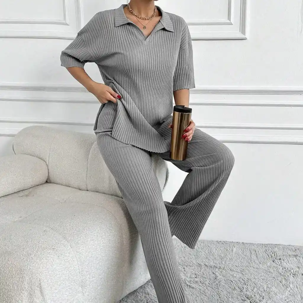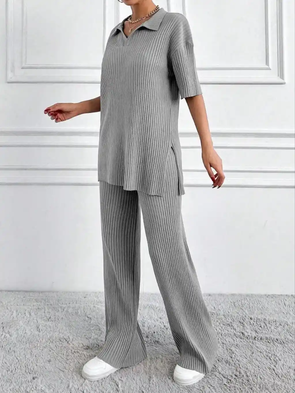 Pantolon yırtmaçlı elbise ikili triko takım vizon elf