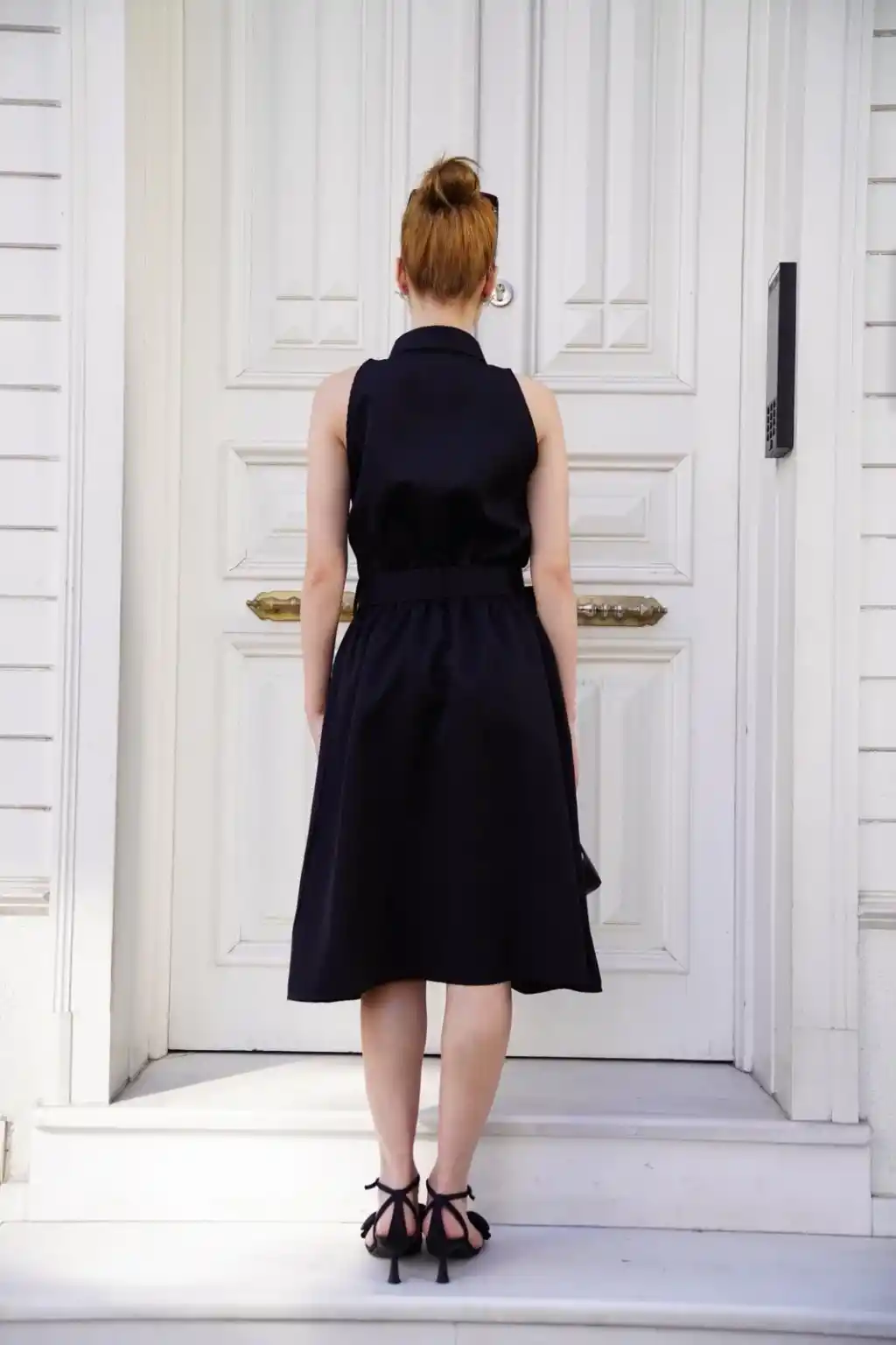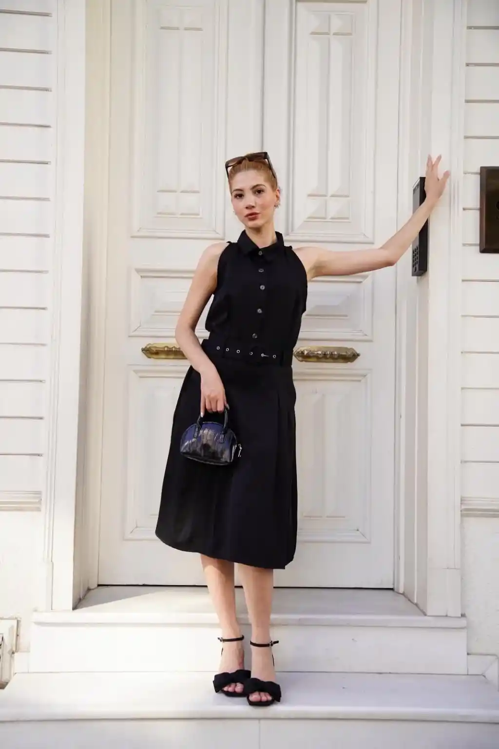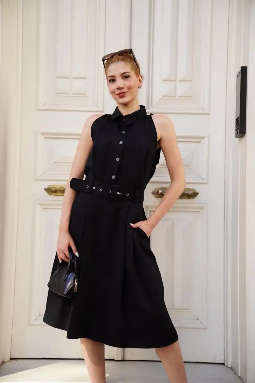 Gömlek yaka kemerli siyah elbise, gardırobunuzun vazgeçilmez parçası olmaya aday! Zarif tasarımıyla dikkat çeken bu elbise, şıklığı ve rahatlığı bir arada sunuyor. %100 pamuklu kumaşı sayesinde gün boyu konforu garantilerken, belindeki kemer detayıyla da feminen bir görünüm sağlıyor. Hem günlük hayatta hem de özel davetlerde rahatlıkla tercih edebileceğiniz bu elbise, şıklık konusunda sizi yalnız bırakmayacak.