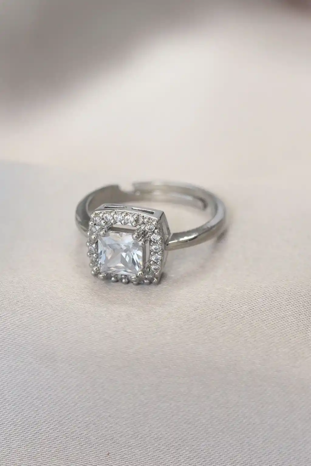 Gümüş Renk Baget ve Zirkon Taşlı Kare Yüzük