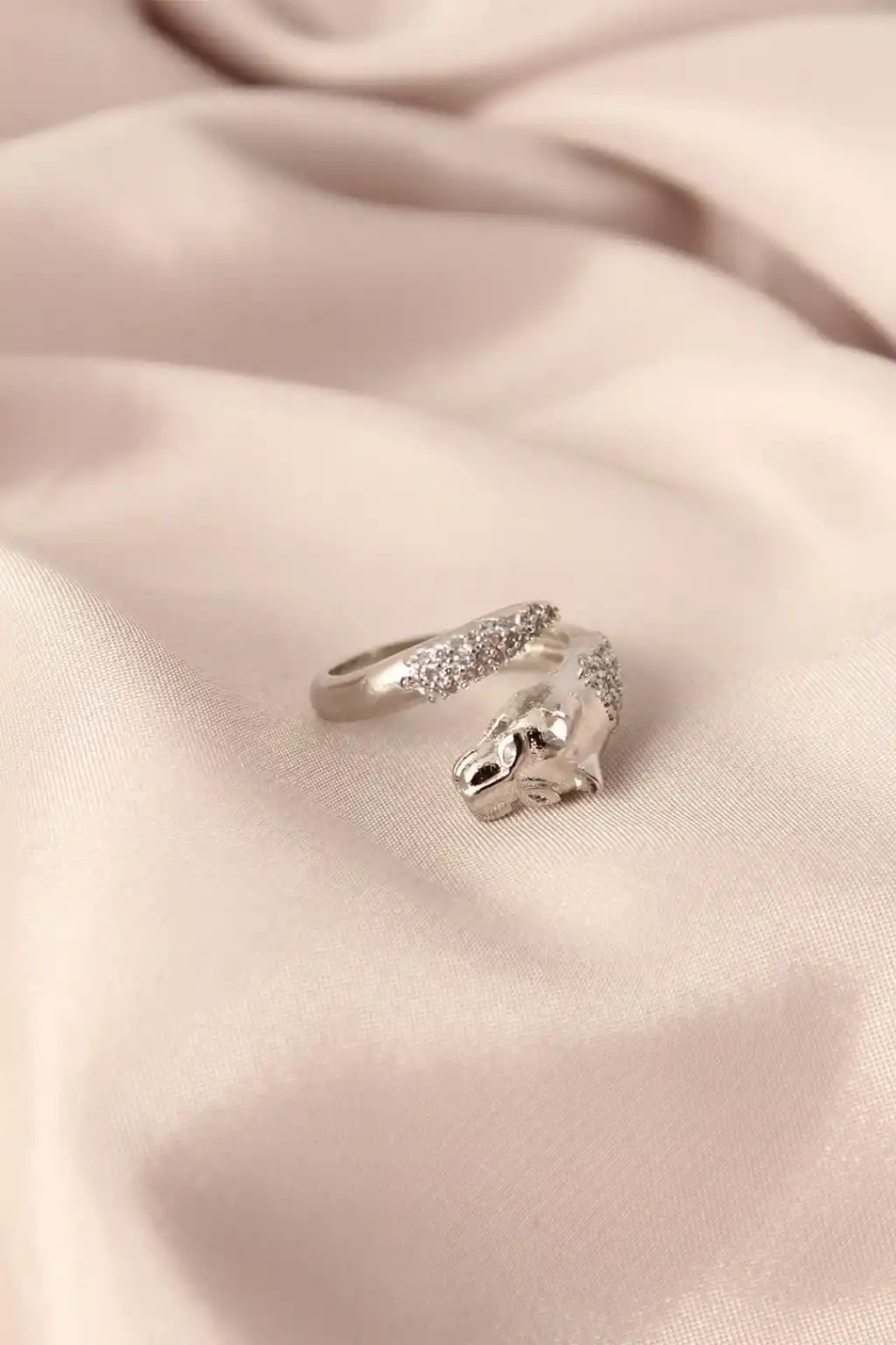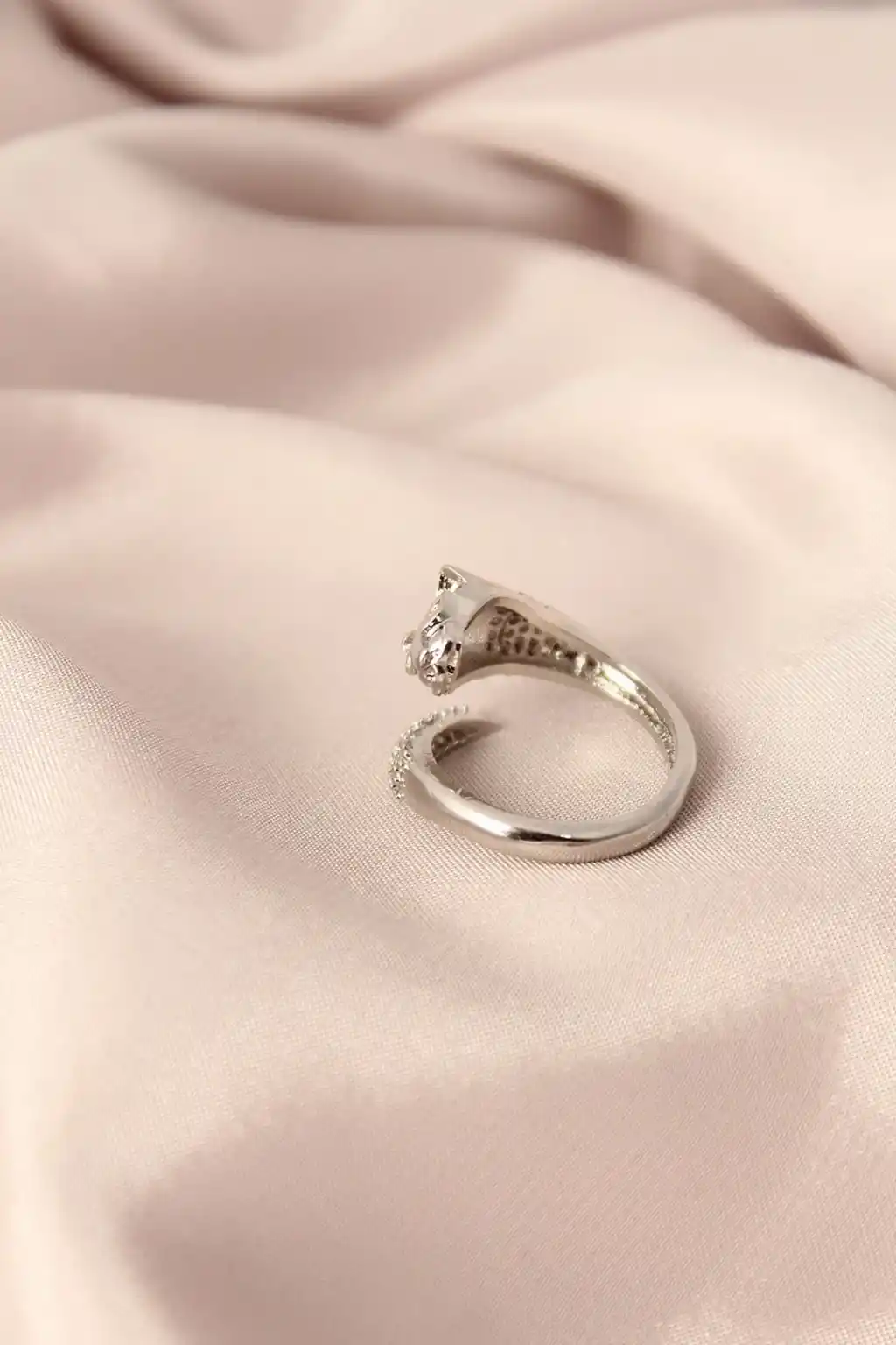 Gümüş Renk Metal Zirkon Taşlı Kaplan Model Ayarlanabilir Kadın Yüzük