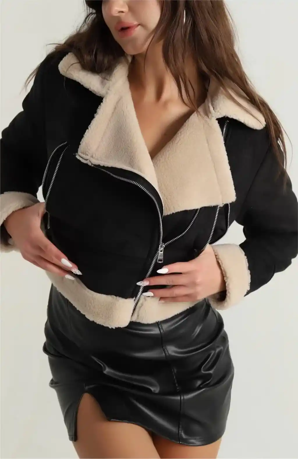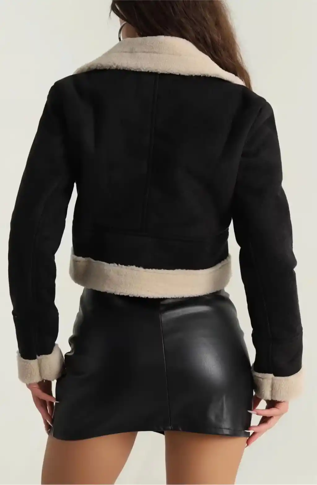 İçi kürklü dışı süet kısa kaban, şıklık ve konforu bir arada sunuyor. Klasik siyah rengi ile her kombinasyona uyum sağlayan bu kaban, soğuk havalarda sizi sıcacık tutacak.
