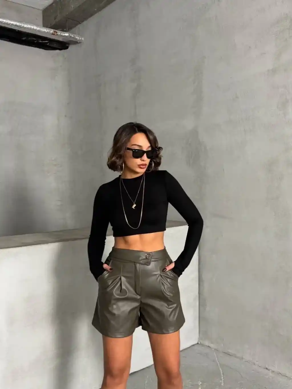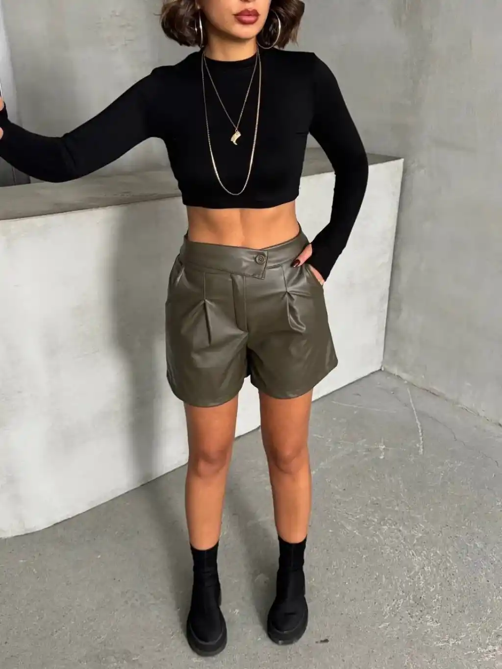 Beli lastikli çıtçıtlı deri şort kahve w241007