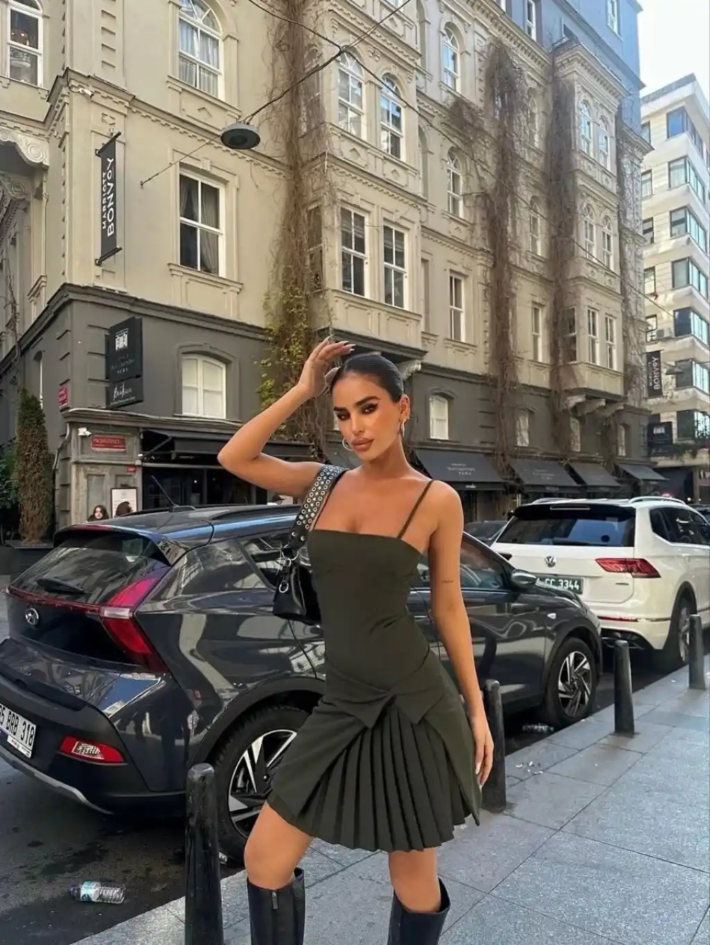 İki Parçalı Pileli Askılı Kadın Mini Elbise - Haki