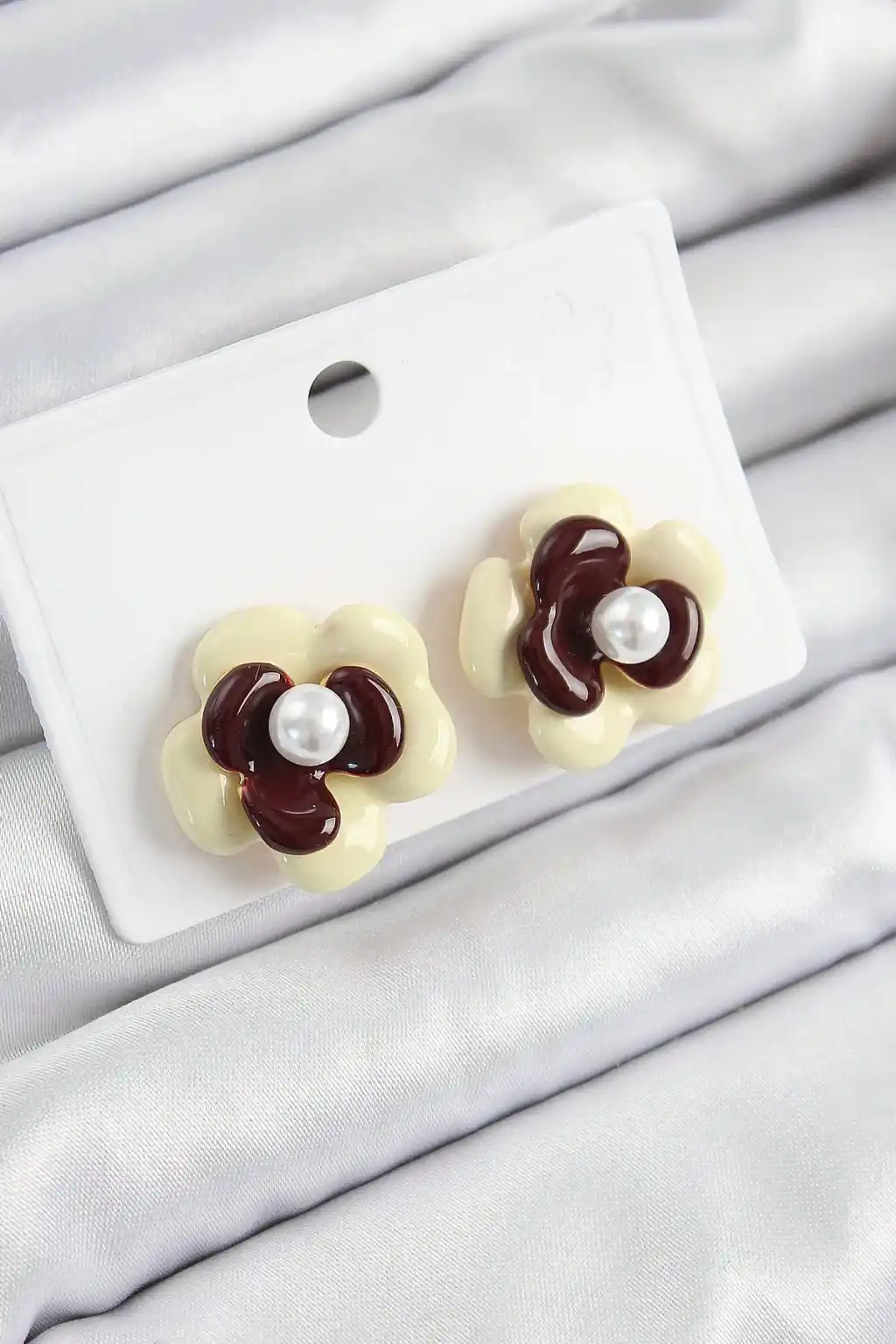 İnci Detaylı Krem Kahverengi Renk Papatya Model Kadın Küpe