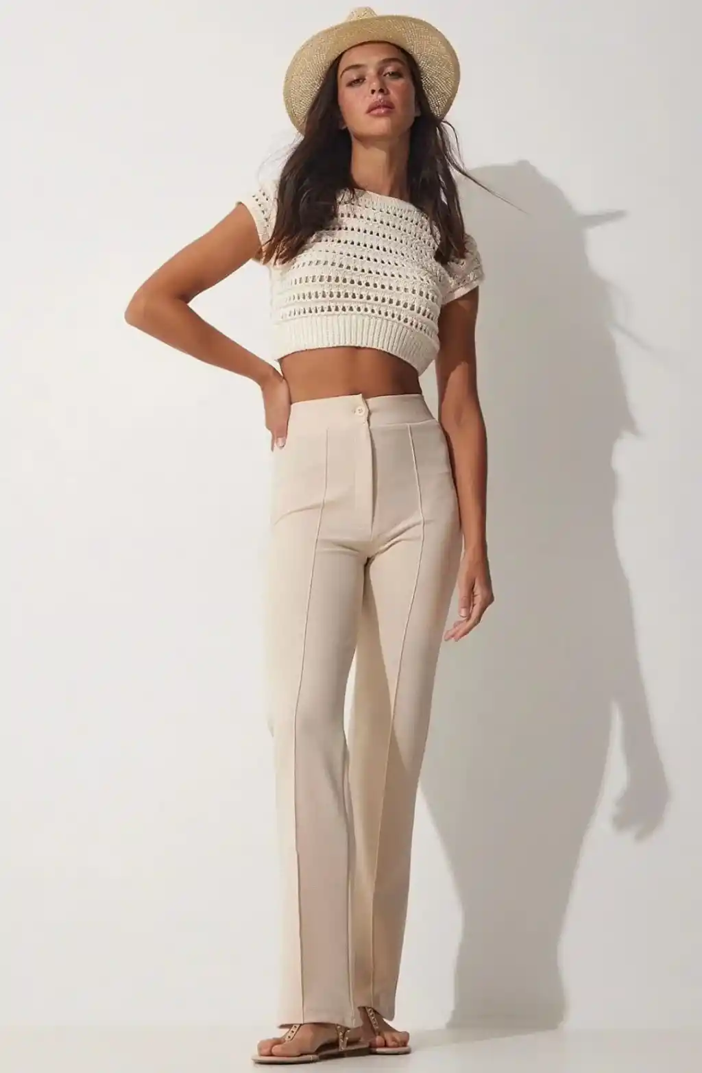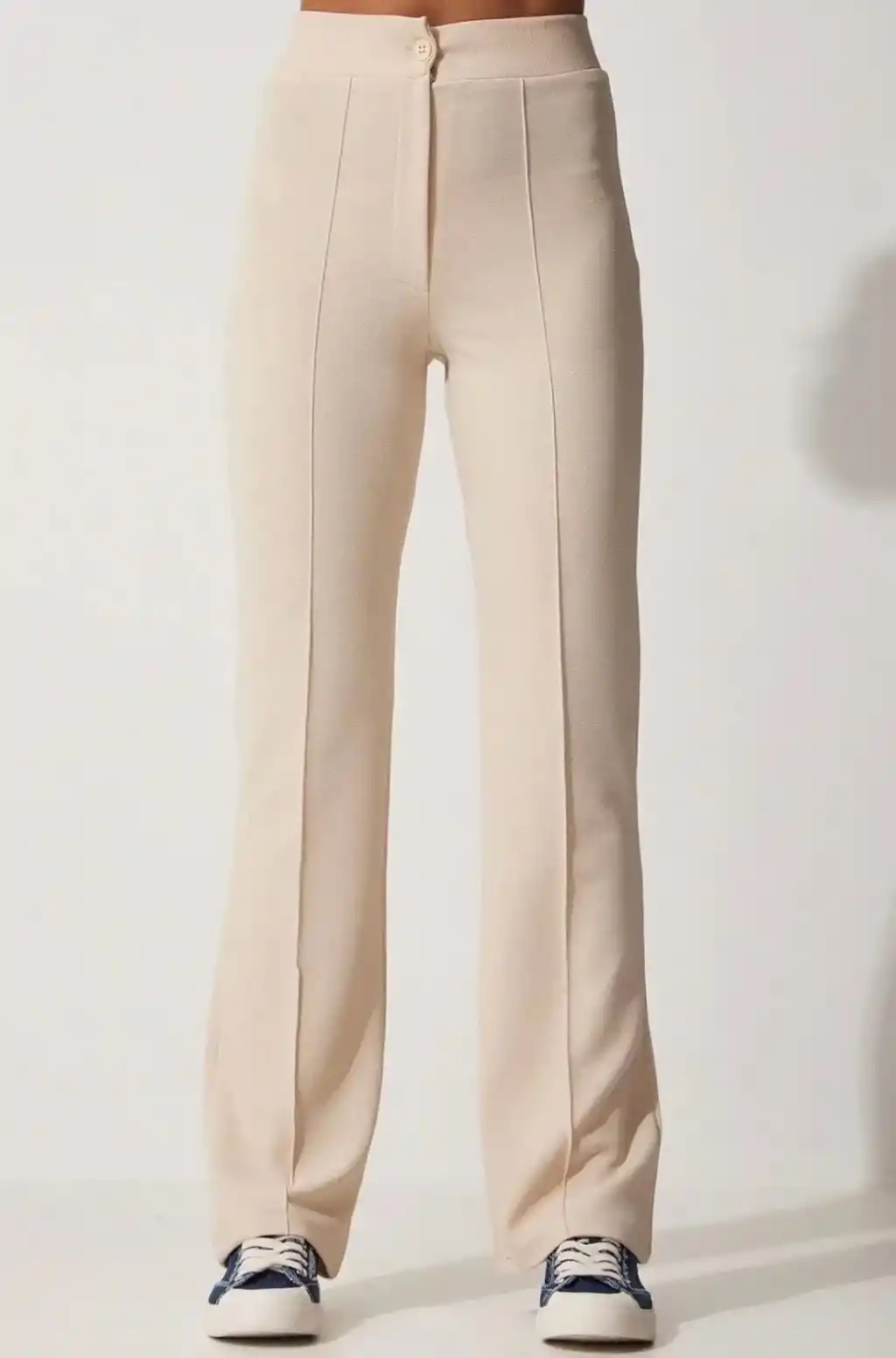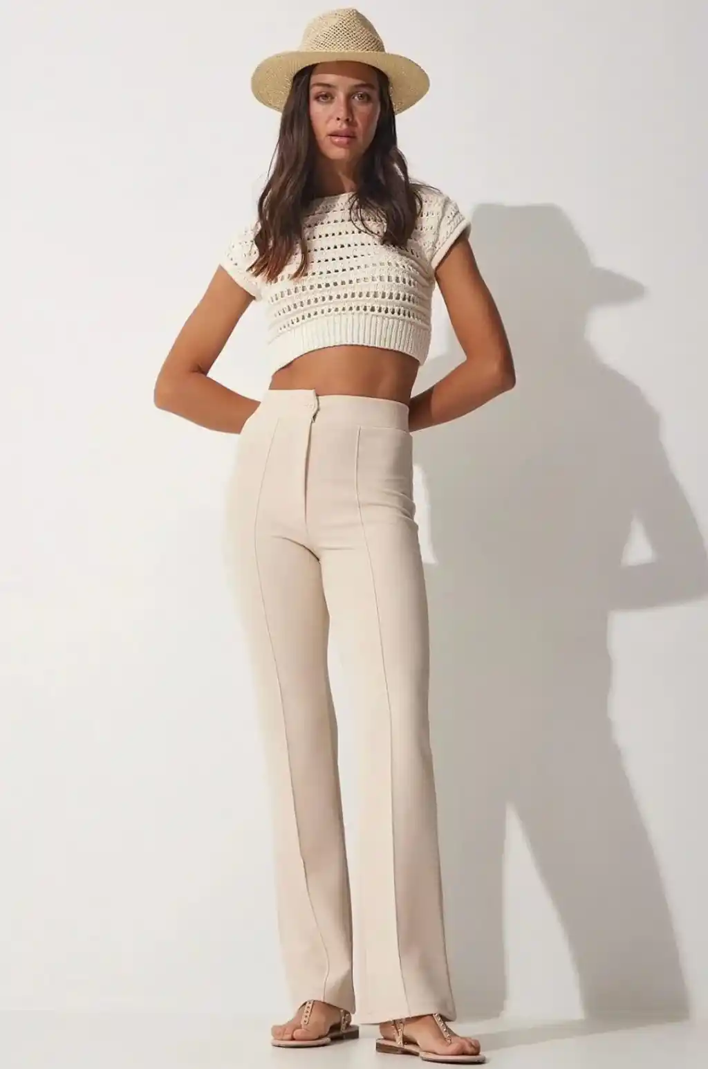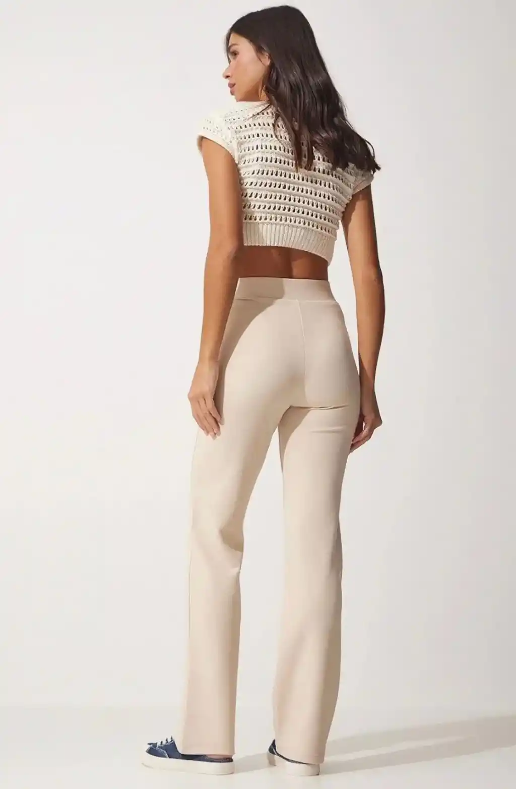 İspanyol yırtmaçlı paça deri pantolon bej hn
