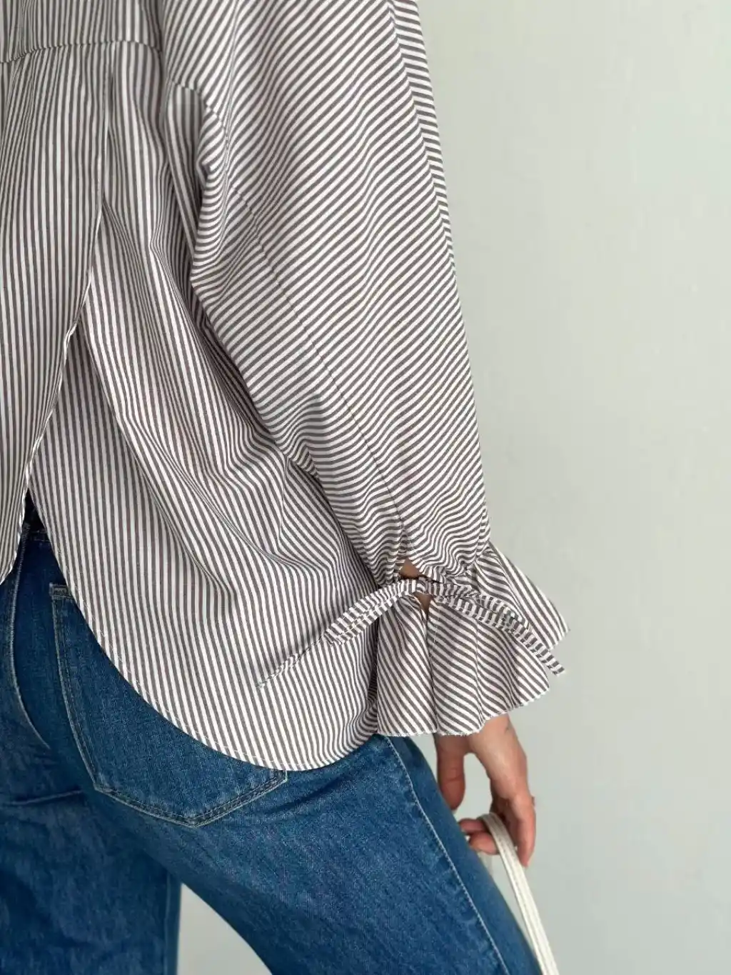 Kadın Arkası Asimetrik Yırtmaç Kesim Detaylı Cizgili Bluz Gömlek - Gri